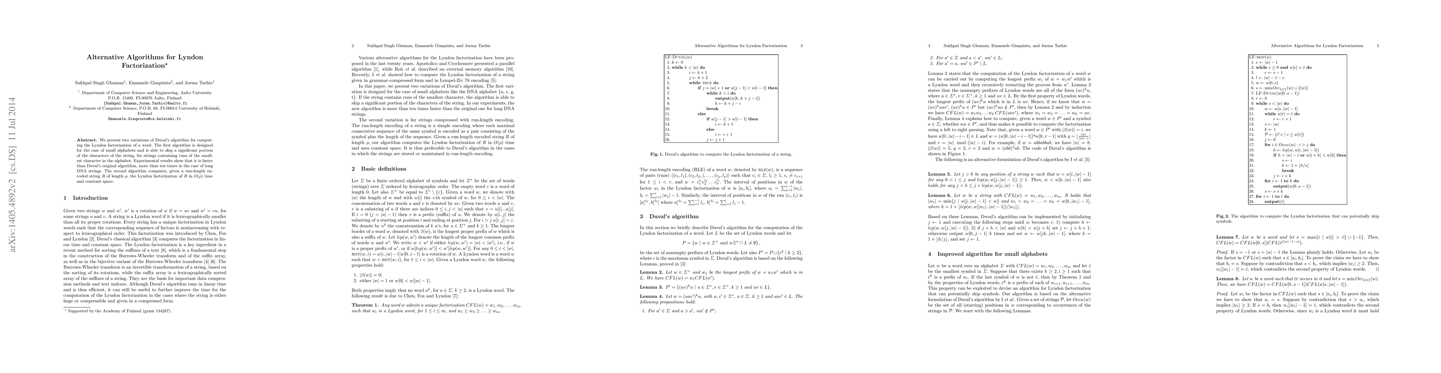 We present two variations of Duval's algorithm for computing the Lyndon factorization of a word. The first algorithm is designed for the case of small alphabets and is able to skip a significant portion of the characters of the string, for strings containing runs of the smallest character in the alphabet. Experimental results show that it is faster than Duval's original algorithm, more than ten times in the case of long DNA strings. The second algorithm computes, given a run-length encoded string $R$ of length $\rho$, the Lyndon factorization of $R$ in $O(\rho)$ time and constant space.