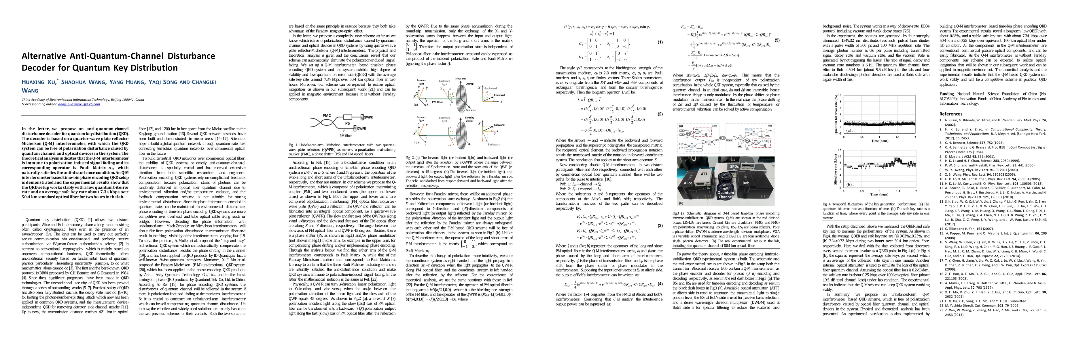This paper proposes an anti-quantum-channel disturbance decoder using a Q-M interferometer for quantum key distribution (QKD), which effectively mitigates polarization disturbances. Experimental results show stable operation with a low error rate and a safe key rate of 7.34 kbps over 50.4 km of fiber.