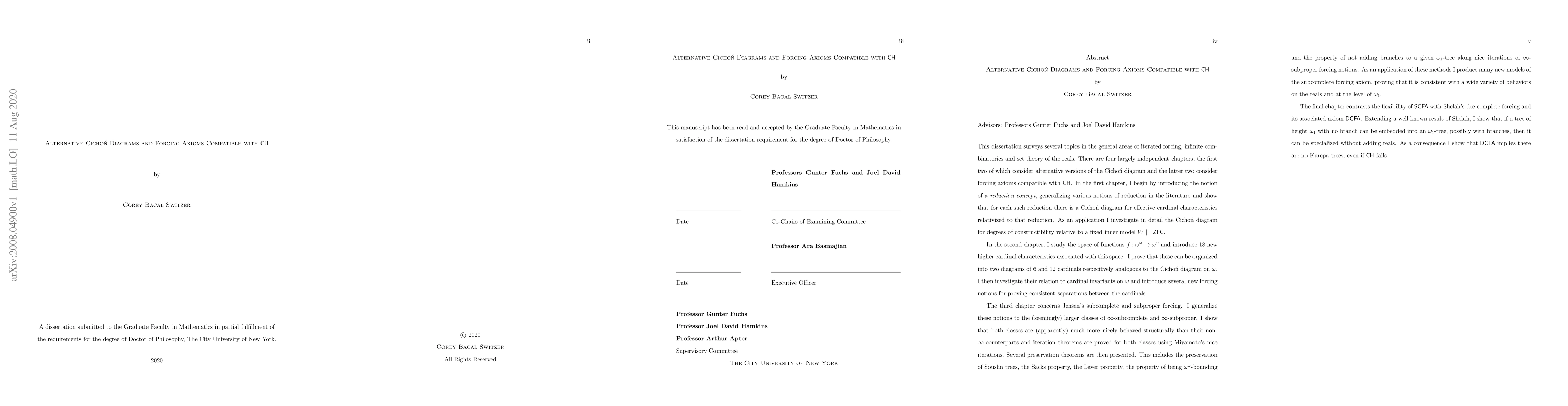 This dissertation surveys several topics in the general areas of iterated forcing, infinite combinatorics and set theory of the reals. There are two parts. In the first half I consider alternative versions of the Cicho\'n diagram. First I show that for a wide variety of reduction concepts there is a Cicho\'n diagram for effective cardinal characteristics relativized to that reduction. As an application I investigate in detail the Cicho\'n diagram for degrees of constructibility relative to a fixed inner model of ZFC. Then I study generalizations of cardinal characteristics to the space of functions $f:\omega^\omega \to \omega^\omega$. I prove that these cardinals can be organized into two diagrams analogous to the standard Cicho\'n diagram, prove several independence results and investigate the relation between these cardinals and the standard cardinal invariants on omega. In the second half of the thesis I look at forcing axioms compatible with CH. First I consider Jensen's subcomplete and subproper forcing. I generalize these notions to larger classes which are (apparently) much more nicely behaved structurally. I prove iteration and preservation theorems for both classes and use these to produce many new models of the subcomplete forcing axiom. Finally I deal with dee-complete forcing and its associated axiom DCFA. Extending a well-known result of Shelah, I show that if a tree of height $\omega_1$ with no branch can be embedded into an $\omega_1$-tree, possibly with uncountable branches, then it can be specialized without adding reals. As a consequence I give a fleshed out proof that DCFA implies there are no Kurepa trees, even if CH fails.