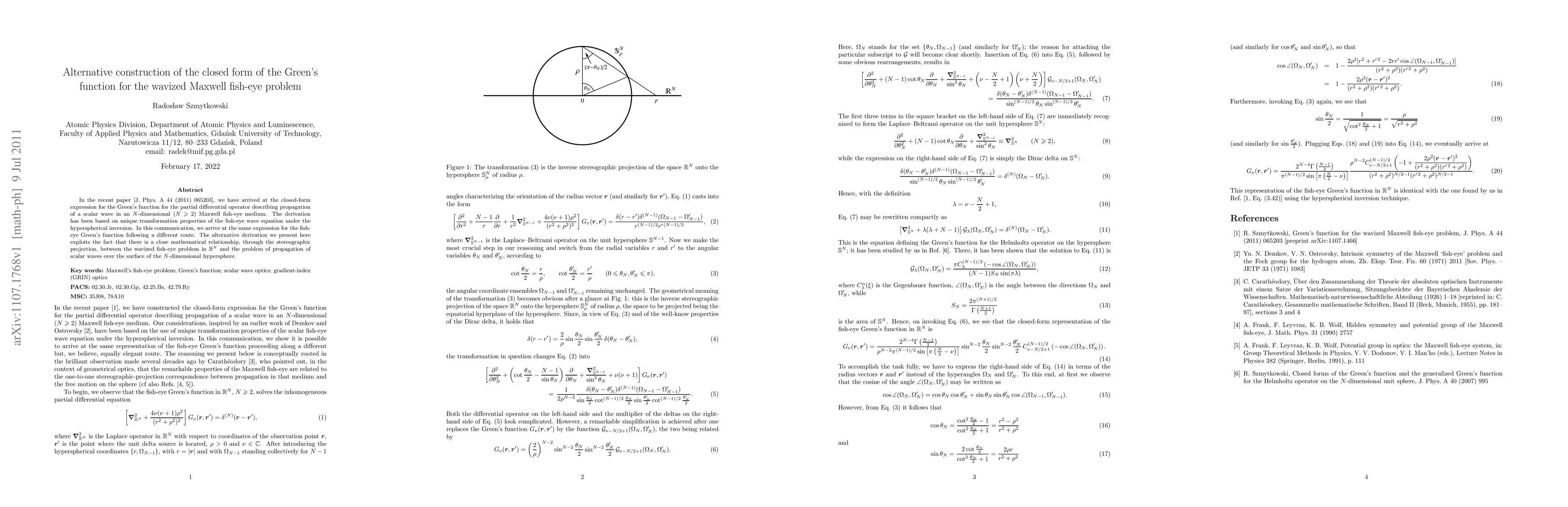 In the recent paper [J.\ Phys.\ A 44 (2011) 065203], we have arrived at the closed-form expression for the Green's function for the partial differential operator describing propagation of a scalar wave in an $N$-dimensional ($N\geqslant2$) Maxwell fish-eye medium. The derivation has been based on unique transformation properties of the fish-eye wave equation under the hyperspherical inversion. In this communication, we arrive at the same expression for the fish-eye Green's function following a different route. The alternative derivation we present here exploits the fact that there is a close mathematical relationship, through the stereographic projection, between the wavized fish-eye problem in $\mathbb{R}^{N}$ and the problem of propagation of scalar waves over the surface of the $N$-dimensional hypersphere.