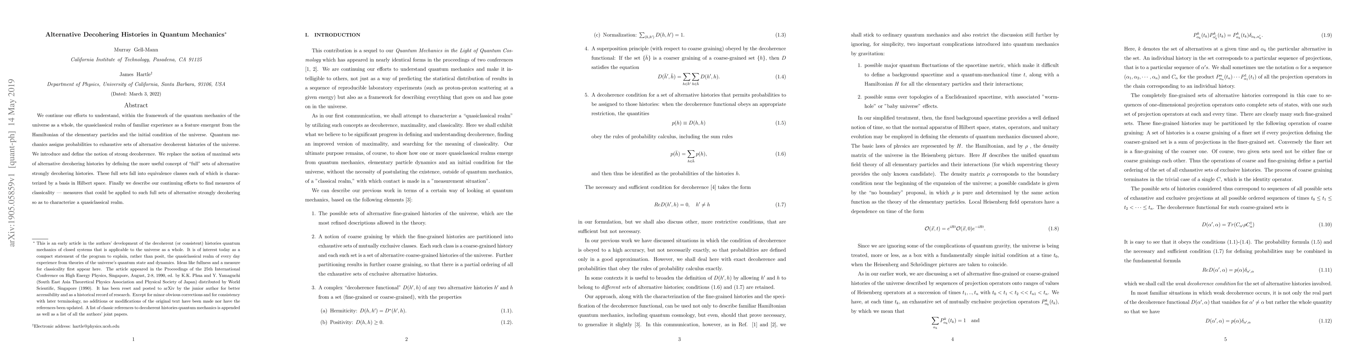 This paper explores the quantum mechanics of the universe, focusing on the emergence of the quasiclassical realm from the Hamiltonian of elementary particles. It introduces the concept of strong decoherence and defines "full" sets of alternative strongly decohering histories, aiming to characterize a quasiclassical realm through measures of classicality.