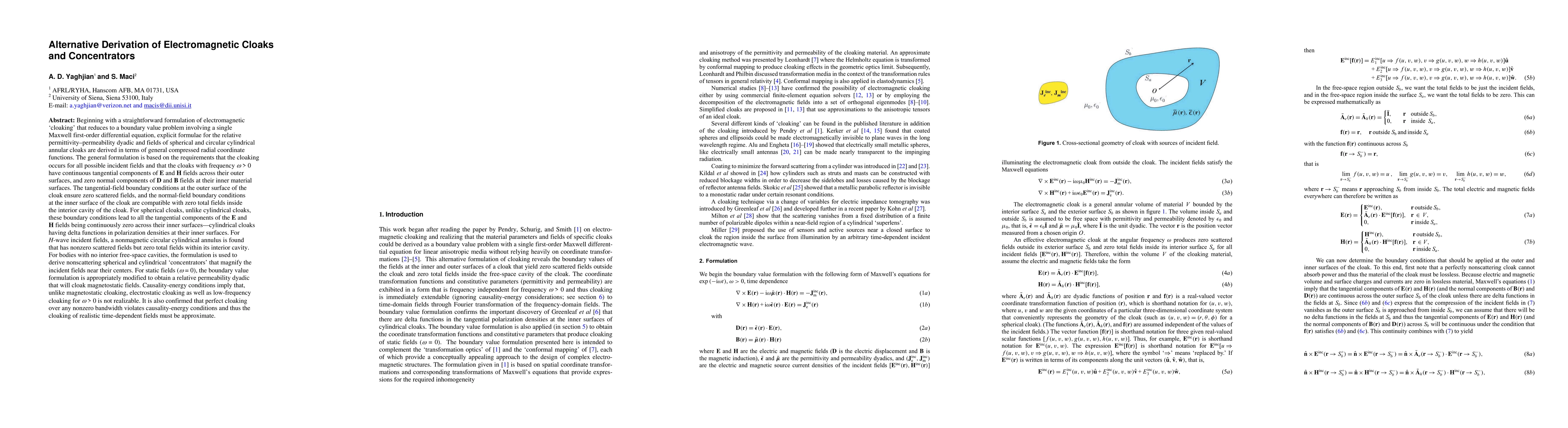 Beginning with a straightforward formulation of electromagnetic cloaking that reduces to a boundary value problem involving a single Maxwell first-order differential equation, explicit formulae for the relative permittivity-permeability dyadic and fields of spherical and circular cylindrical annular cloaks are derived in terms of general compressed radial coordinate functions. The general formulation is based on the requirements that the cloaking occurs for all possible incident fields and that the cloaks with frequency w > 0 have continuous tangential E and H fields across their outer surfaces, and zero normal D and B fields at their inner material surfaces. The tangential-field boundary conditions at the outer surface of the cloak ensure zero scattered fields, and the normal-field boundary conditions at the inner surface of the cloak are compatible with zero total fields inside the interior cavity of the cloak. For spherical cloaks, unlike cylindrical cloaks, these boundary conditions lead to all the tangential components of the E and H fields being continuously zero across their inner surfaces -- cylindrical cloaks having delta functions in polarization densities at their inner surfaces. For bodies with no interior free-space cavities, the formulation is used to derive nonscattering spherical and cylindrical concentrators that magnify the incident fields near their centers. For static fields (w = 0), the boundary value formulation is appropriately modified to obtain a permeability dyadic that will cloak magnetostatic fields. Causality conditions imply that, unlike magnetostatic cloaking, electrostatic cloaking as well as low-frequency cloaking for w > 0 is not realizable.
