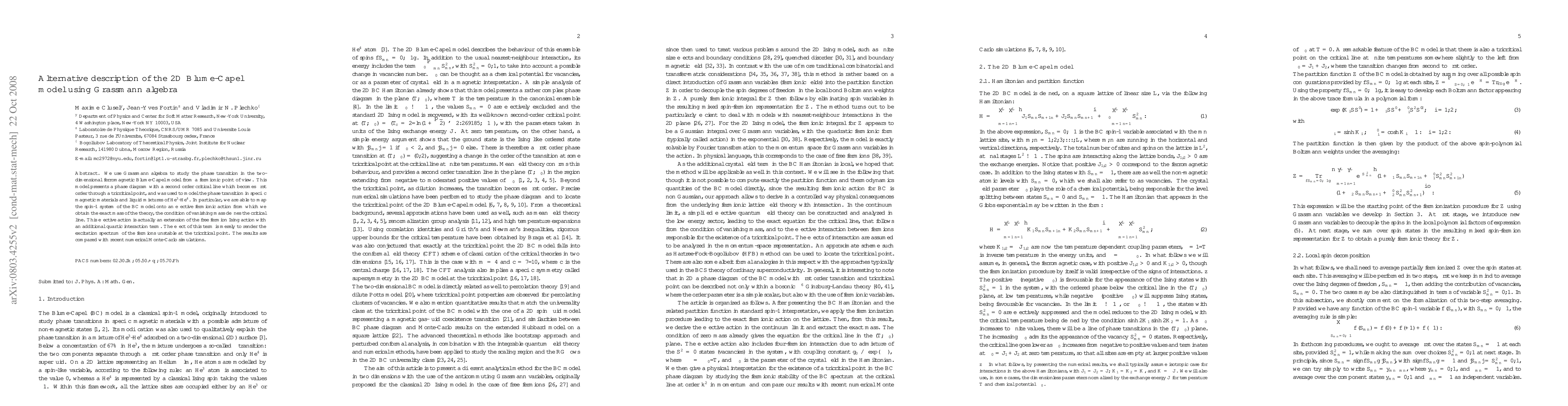 This research employs Grassmann algebra to analyze the 2D Blume-Capel model, a spin-1 system, as a fermionic model. It derives an effective fermionic action with a quartic interaction, revealing the critical line and tricritical point, and compares these results with Monte-Carlo simulations.