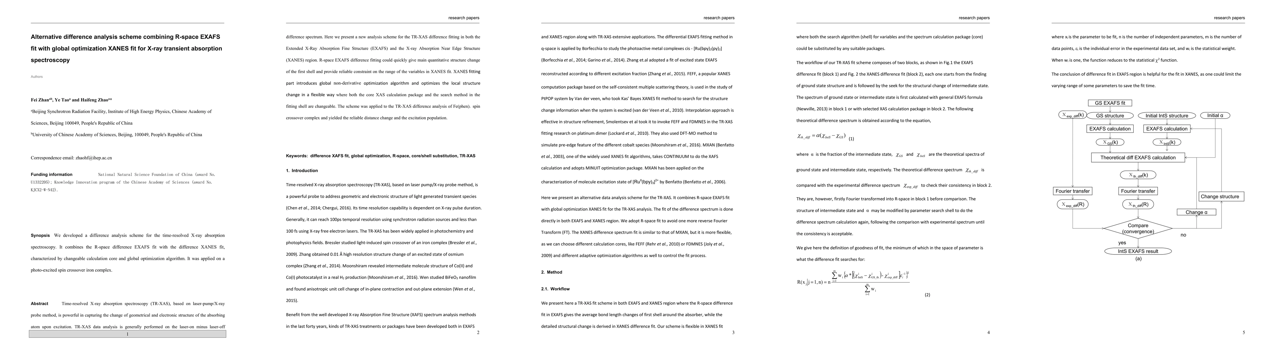 Time-resolved X-ray absorption spectroscopy (TR-XAS), based on laser-pump/X-ray probe method, is powerful in capturing the change of geometrical and electronic structure of the absorbing atom upon excitation. TR-XAS data analysis is generally performed on the laser-on minus laser-off difference spectrum. Here we present a new analysis scheme for the TR-XAS difference fitting in both the Extended X-Ray Absorption Fine Structure (EXAFS) and the X-ray Absorption Near Edge Structure (XANES) region. R-space EXAFS difference fitting could quickly give main quantitative structure change of the first shell and provide reliable constraint on the range of the variables in XANES fit. XANES fitting part introduces global non-derivative optimization algorithm and optimizes the local structure change in a flexible way where both the core XAS calculation package and the search method in the fitting shell are changeable. The scheme was applied to the TR-XAS difference analysis of Fe(phen)3 spin crossover complex and yielded the reliable distance change and the excitation population.