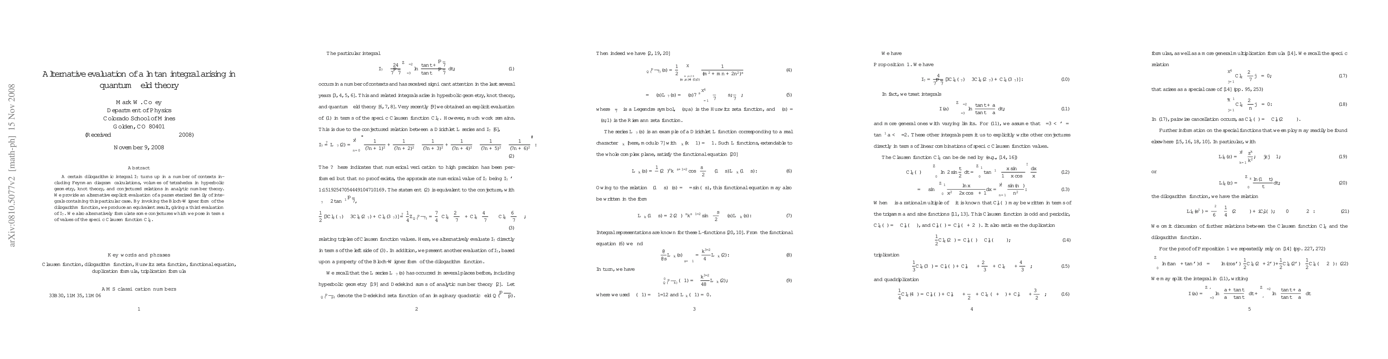 A certain dilogarithmic integral I_7 turns up in a number of contexts including Feynman diagram calculations, volumes of tetrahedra in hyperbolic geometry, knot theory, and conjectured relations in analytic number theory. We provide an alternative explicit evaluation of a parameterized family of integrals containing this particular case. By invoking the Bloch-Wigner form of the dilogarithm function, we produce an equivalent result, giving a third evaluation of I_7. We also alternatively formulate some conjectures which we pose in terms of values of the specific Clausen function Cl_2.