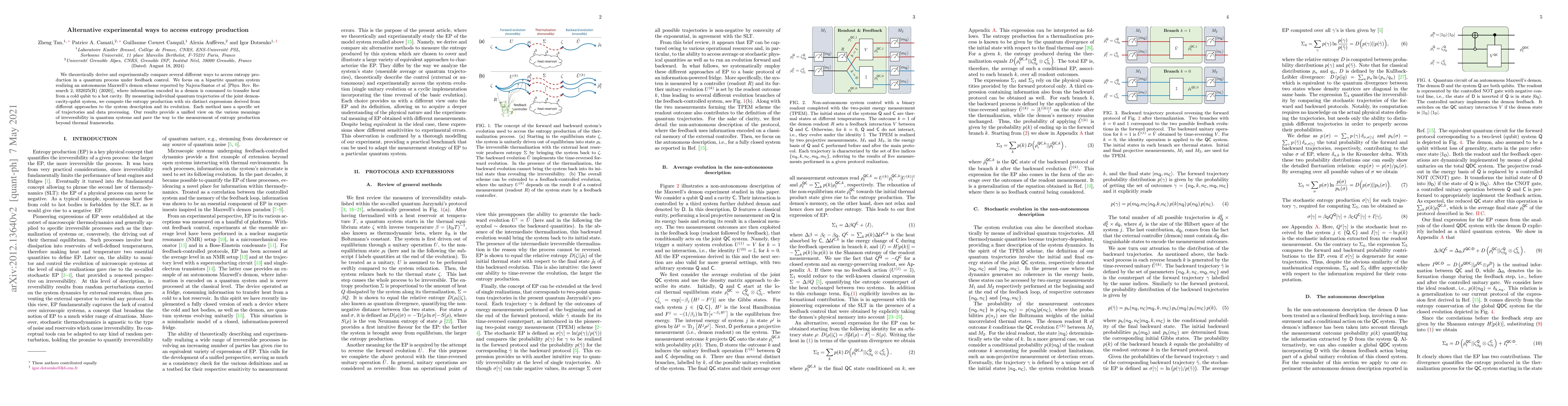 We theoretically derive and experimentally compare several different ways to access entropy production in a quantum process under feedback control. We focus on a bipartite quantum system realizing an autonomous Maxwell's demon scheme reported by Najera-Santos et al. [Phys.~Rev.~Research 2, 032025(R) (2020)], where information encoded in a demon is consumed to transfer heat from a cold qubit to a hot cavity. By measuring individual quantum trajectories of the joint demon-cavity-qubit system, we compute the entropy production with six distinct expressions derived from different approaches to the system description and its evolution. Each method uses a specific set of trajectories and data processing. Our results provide a unified view on the various meanings of irreversibility in quantum systems and pave the way to the measurement of entropy production beyond thermal frameworks.