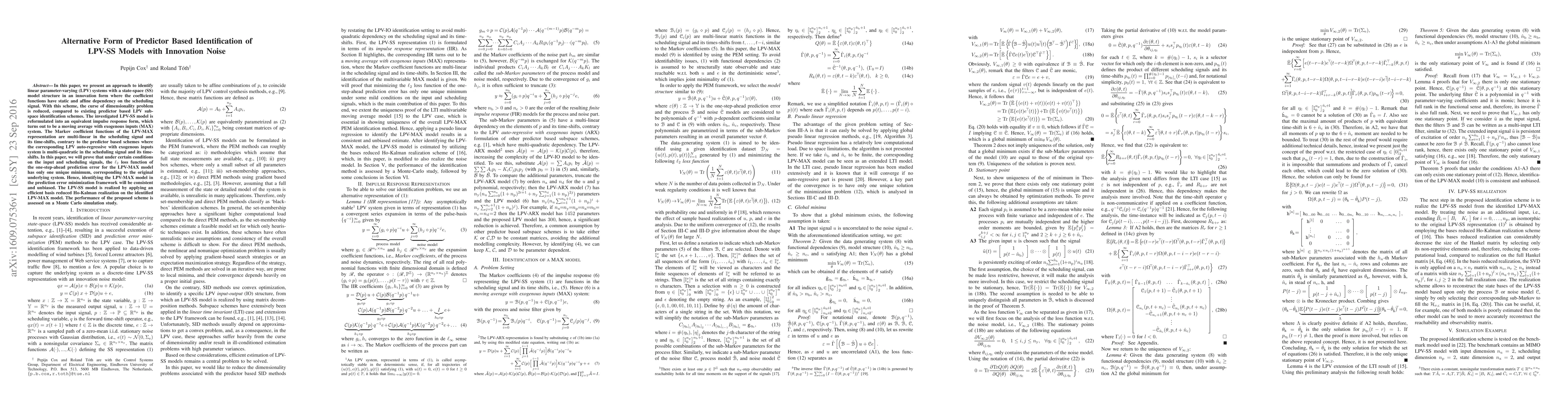 This paper proposes an innovative method for identifying linear parameter-varying state-space models in an innovation form, reducing the curse of dimensionality. The method reformulates the LPV-SS model into an equivalent LPV-MAX system, which is more efficient and results in a unique minimum in the prediction error loss function, ensuring consistent and unbiased identification.