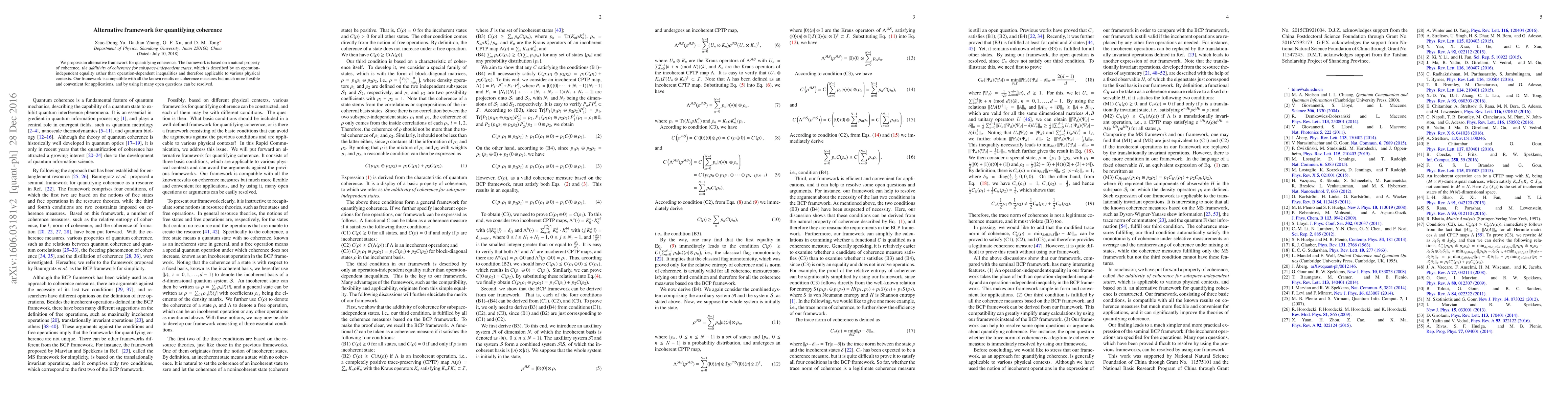 We propose an alternative framework for quantifying coherence. The framework is based on a natural property of coherence, the additivity of coherence for subspace-independent states, which is described by an operation-independent equality rather than operation-dependent inequalities and therefore applicable to various physical contexts. Our framework is compatible with all the known results on coherence measures but much more flexible and convenient for applications, and by using it many open questions can be resolved.