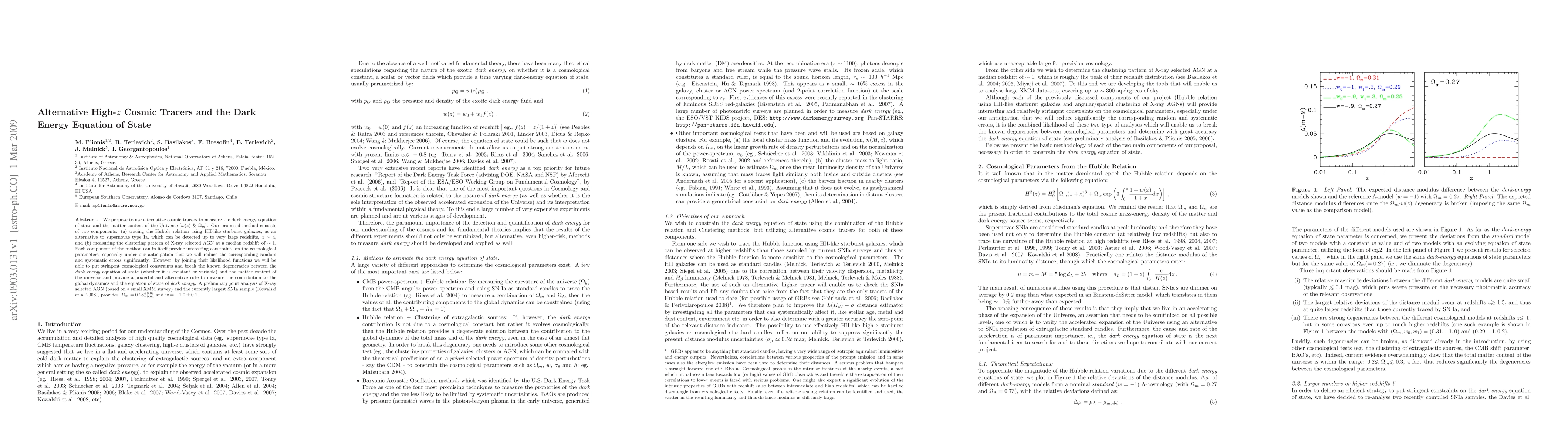 We propose to use alternative cosmic tracers to measure the dark energy equation of state and the matter content of the Universe [w(z) & \Omega_m]. Our proposed method consists of two components: (a) tracing the Hubble relation using HII-like starburst galaxies, as an alternative to SNIa, which can be detected up to very large redshifts, z~4, and (b) measuring the clustering pattern of X-ray selected AGN at a median redshift of ~1. Each component of the method can in itself provide interesting constraints on the cosmological parameters, especially under our anticipation that we will reduce the corresponding random and systematic errors significantly. However, by joining their likelihood functions we will be able to put stringent cosmological constraints and break the known degeneracies between the dark energy equation of state (whether it is constant or variable) and the matter content of the universe and provide a powerful and alternative rute to measure the contribution to the global dynamics, and the equation of state, of dark energy. A preliminary joint analysis of X-ray selected AGN (based on a small XMM survey) and the currently largest SNIa sample (Kowalski et al 2008), provides: Omega_m=0.28^{+0.02}_{-0.04} and w=-1.0 +-0.1.