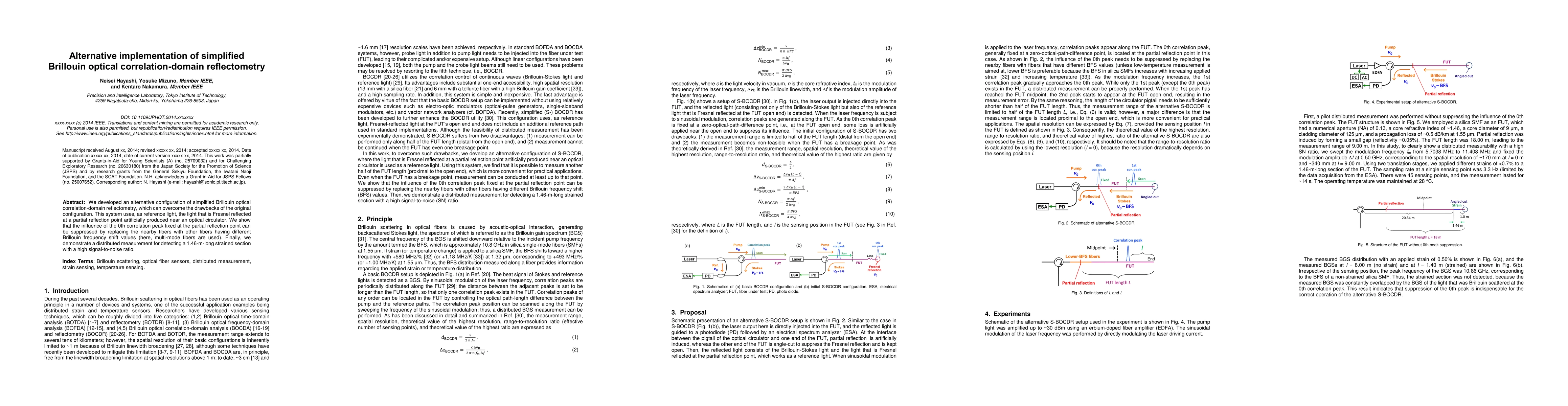 We developed an alternative configuration of simplified Brillouin optical correlation-domain reflectometry, which can overcome the drawbacks of the original configuration. This system uses, as reference light, the light that is Fresnel reflected at a partial reflection point artificially produced near an optical circulator. We show that the influence of the 0th correlation peak fixed at the partial reflection point can be suppressed by replacing the nearby fibers with other fibers having different Brillouin frequency shift values (here, multi-mode fibers are used). Finally, we demonstrate a distributed measurement for detecting a 1.46-m-long strained section with a high signal-to-noise ratio.