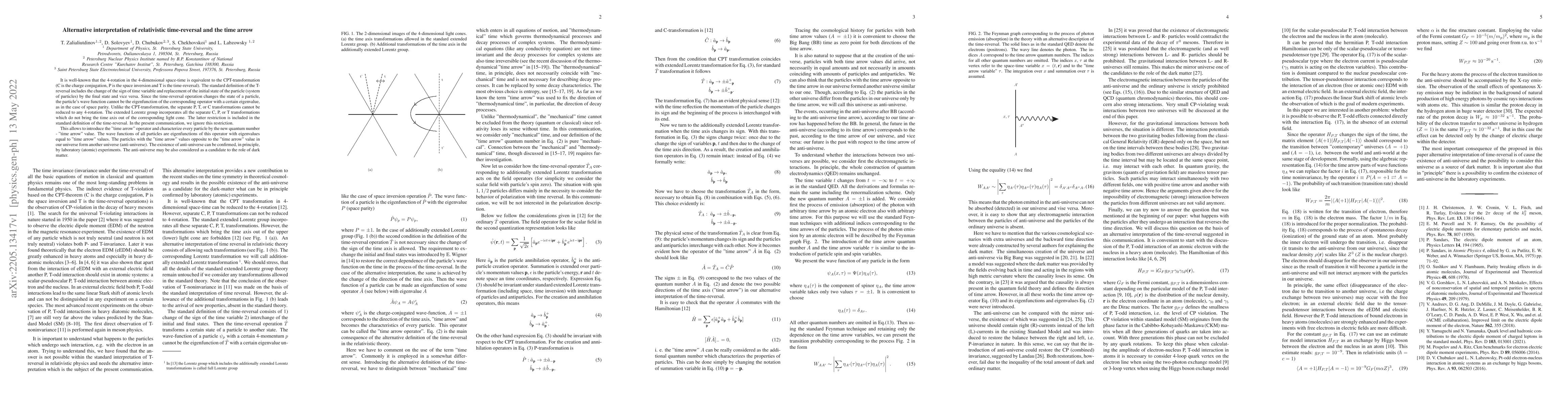 It is well-known that the 4-rotation in the 4-dimensional space-time is equivalent to the CPT-transformation (C is the charge conjugation, P is the space inversion and T is the time-reversal). The standard definition of the T-reversal includes the change of the sign of time variable and replacement of the initial state of the particle (system of particles) by the final state and vice versa. Since the time-reversal operation changes the state of a particle, the particle's wave function cannot be the eigenfunction of the corresponding operator with a certain eigenvalue, as in the case of space parity. Unlike the CPT-transformation, the separate P, T, or C transformations cannot be reduced to any 4-rotation. The extended Lorentz group incorporates all the separate C, P, or T transformations which do not bring the time axis out of the corresponding light cone. The latter restriction is included in the standard definition of the time-reversal. In the present communication, we ignore this restriction. This allows to introduce the "time arrow" operator and characterize every particle by the new quantum number - "time arrow" value. The wave functions of all particles are eigenfunctions of this operator with eigenvalues equal to "time arrow" values. The particles with the "time arrow" values opposite to the "time arrow" value in our universe form another universe (anti-universe). The existence of anti-universe can be confirmed, in principle, by laboratory (atomic) experiments. The anti-universe may be also considered as a candidate to the role of dark matter.