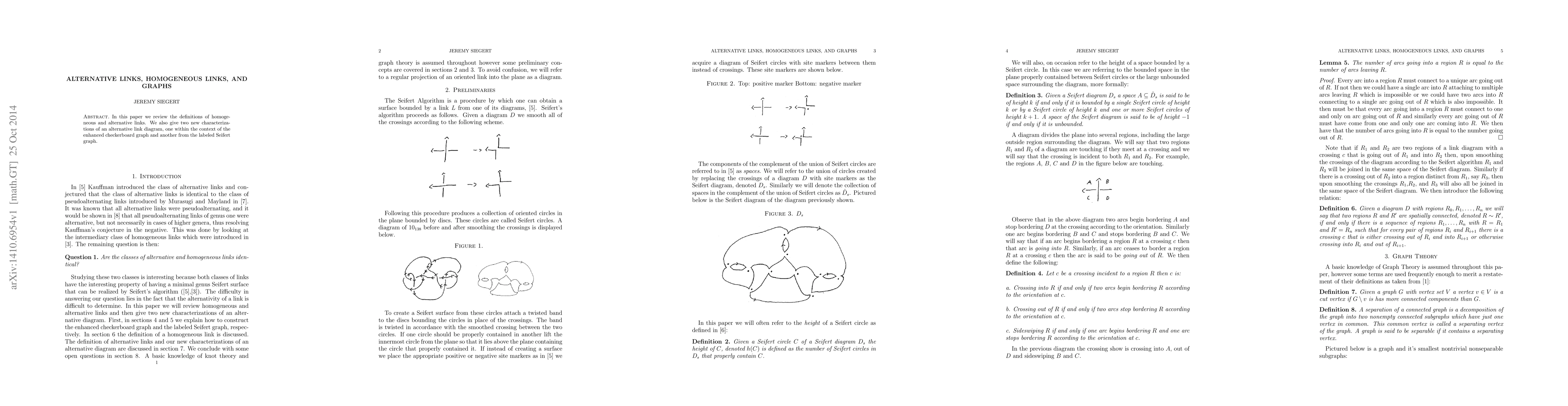 This paper reviews definitions of homogeneous and alternative links and introduces two new characterizations of alternative link diagrams: one based on the enhanced checkerboard graph and another using labeled Seifert graphs.