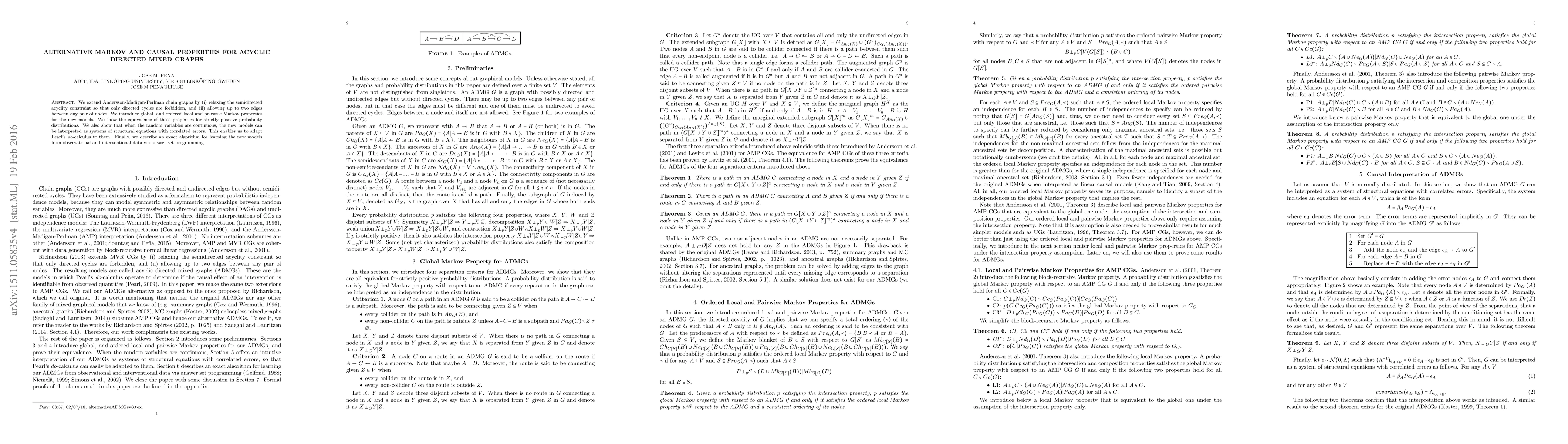 This research introduces new models based on Acyclic Directed Mixed Graphs (ADMGs) by relaxing semidirected acyclity constraints and allowing up to two edges between nodes. It presents global and local Markov properties for these models, proves their equivalence for positive distributions, and demonstrates their interpretation as structural equation models with correlated errors for continuous variables. The paper also adapts Pearl's do-calculus to these models and describes an algorithm for learning them from data using answer set programming.