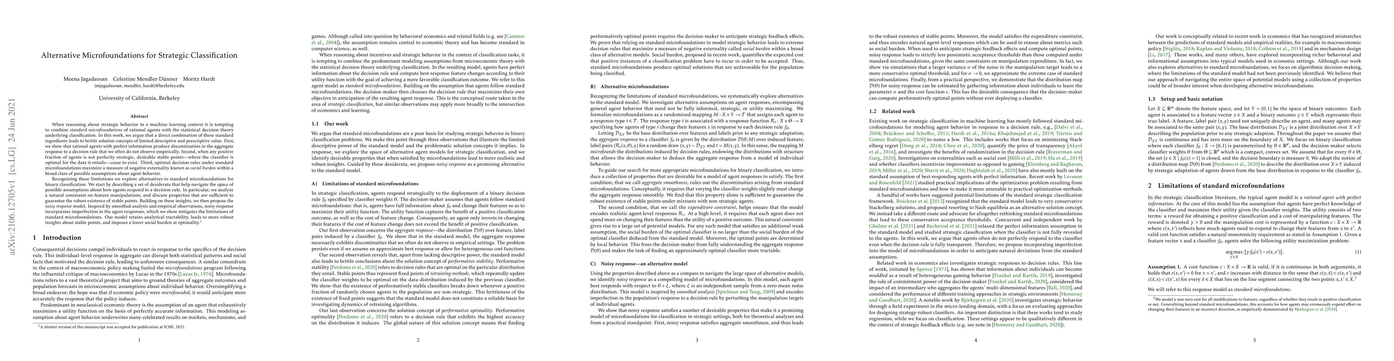 When reasoning about strategic behavior in a machine learning context it is tempting to combine standard microfoundations of rational agents with the statistical decision theory underlying classification. In this work, we argue that a direct combination of these standard ingredients leads to brittle solution concepts of limited descriptive and prescriptive value. First, we show that rational agents with perfect information produce discontinuities in the aggregate response to a decision rule that we often do not observe empirically. Second, when any positive fraction of agents is not perfectly strategic, desirable stable points -- where the classifier is optimal for the data it entails -- cease to exist. Third, optimal decision rules under standard microfoundations maximize a measure of negative externality known as social burden within a broad class of possible assumptions about agent behavior. Recognizing these limitations we explore alternatives to standard microfoundations for binary classification. We start by describing a set of desiderata that help navigate the space of possible assumptions about how agents respond to a decision rule. In particular, we analyze a natural constraint on feature manipulations, and discuss properties that are sufficient to guarantee the robust existence of stable points. Building on these insights, we then propose the noisy response model. Inspired by smoothed analysis and empirical observations, noisy response incorporates imperfection in the agent responses, which we show mitigates the limitations of standard microfoundations. Our model retains analytical tractability, leads to more robust insights about stable points, and imposes a lower social burden at optimality.