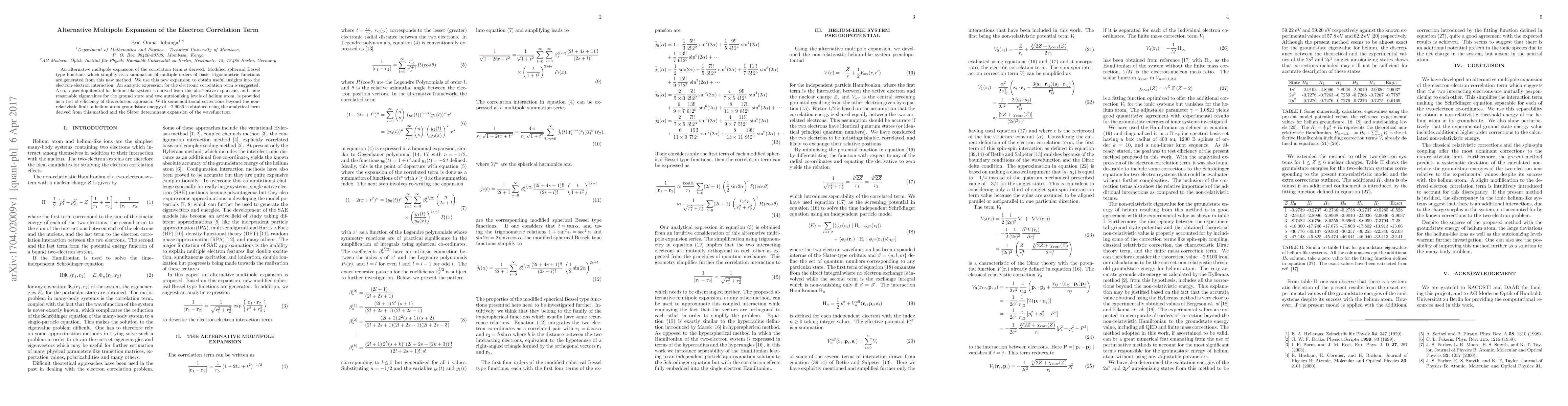 The paper introduces an alternative multipole expansion for the electron correlation term, leading to modified spherical Bessel type functions that simplify to sums of trigonometric functions, and an analytic expression for the electronic correlation term.