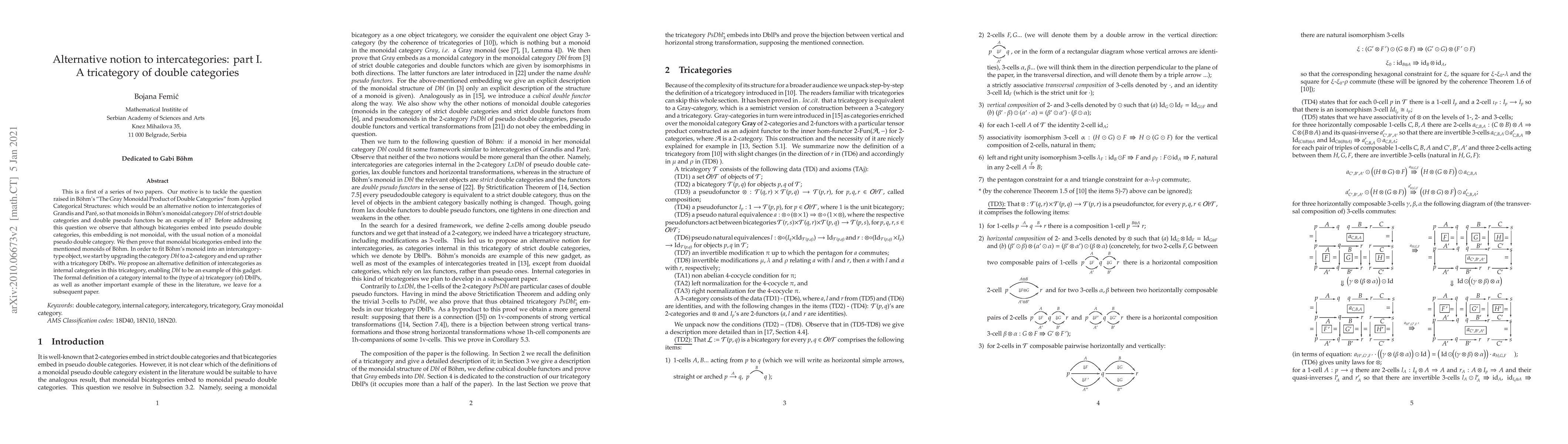 This is a first of a series of two papers. Our motive is to tackle the question raised in B\"ohm's "The Gray Monoidal Product of Double Categories" from Applied Categorical Structures: which would be an alternative notion to intercategories of Grandis and Par\'e, so that monoids in B\"ohm's monoidal category $Dbl$ of strict double categories and double pseudo functors be an example of it? Before addressing this question we observe that although bicategories embed into pseudo double categories, this embedding is not monoidal, with the usual notion of a monoidal pseudo double category. We then prove that monoidal bicategories embed into the mentioned monoids of B\"ohm. In order to fit B\"ohm's monoid into an intercategory-type object, we start by upgrading the category $Dbl$ to a 2-category and end up rather with a tricategory $\DblPs$. We propose an alternative definition of intercategories as internal categories in this tricategory, enabling $Dbl$ to be an example of this gadget. The formal definition of a category internal to the (type of a) tricategory (of) $\DblPs$, as well as another important example of these in the literature, we leave for a subsequent paper.