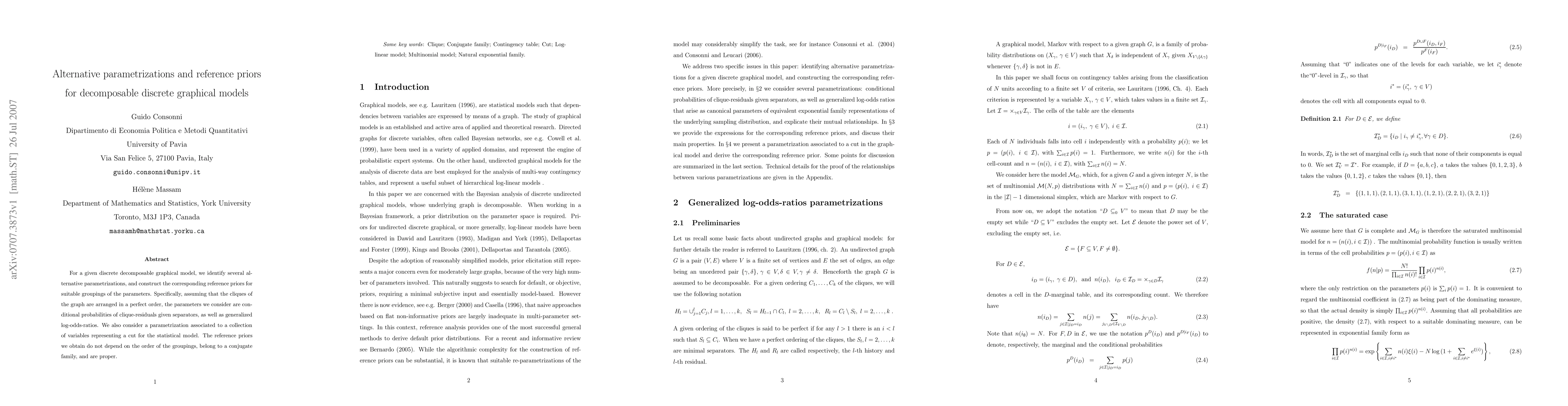This paper explores alternative parametrizations for discrete decomposable graphical models, including conditional probabilities and generalized log-odds-ratios, and constructs corresponding reference priors for these parameters. The reference priors are order-independent, belong to a conjugate family, and are proper.