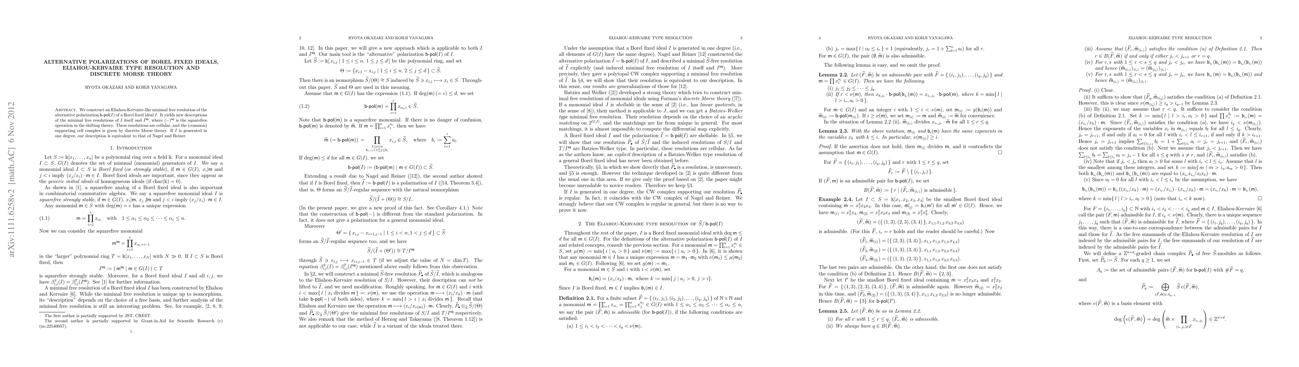 We construct an Eliahou-Kervaire-like minimal free resolution of the alternative polarization $b-pol(I)$ of a Borel fixed ideal $I$. It yields new descriptions of the minimal free resolutions of $I$ itself and $I^sq$, where $(-)^sq$ is the squarefree operation in the shifting theory. These resolutions are cellular, and the (common) supporting cell complex is given by discrete Morse theory. If $I$ is generated in one degree, our description is equivalent to that of Nagel and Reiner.
