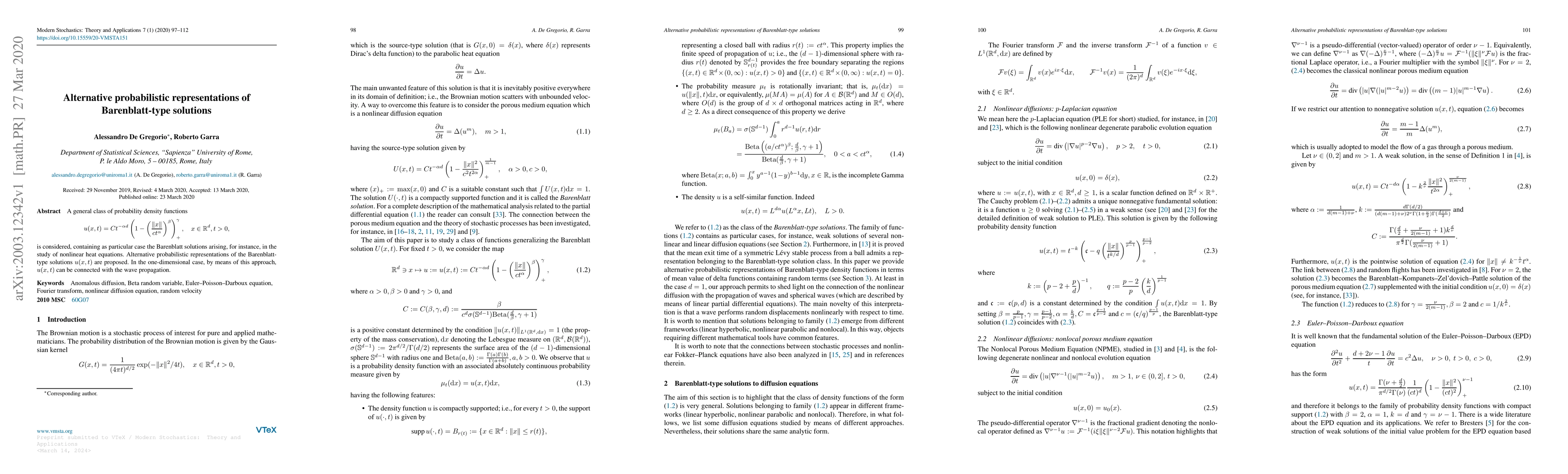 This paper explores alternative probabilistic representations for Barenblatt-type solutions, which are significant in nonlinear heat equations. It proposes a general class of probability density functions and connects these solutions, particularly in one dimension, with wave propagation phenomena.
