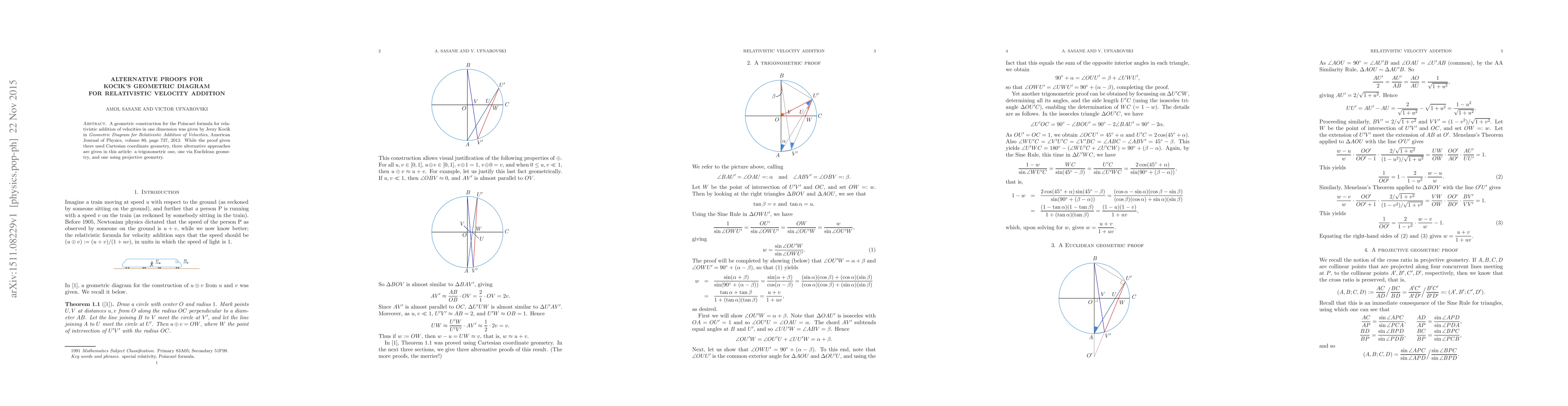 A geometric construction for the Poincare formula for relativistic addition of velocities in one dimension was given by Jerzy Kocik in "Geometric Diagram for Relativistic Addition of Velocities", American Journal of Physics, volume 80, page 737, 2012. While the proof given there used Cartesian coordinate geometry, three alternative approaches are given in this article: a trigonometric one, one via Euclidean geometry, and one using projective geometry.