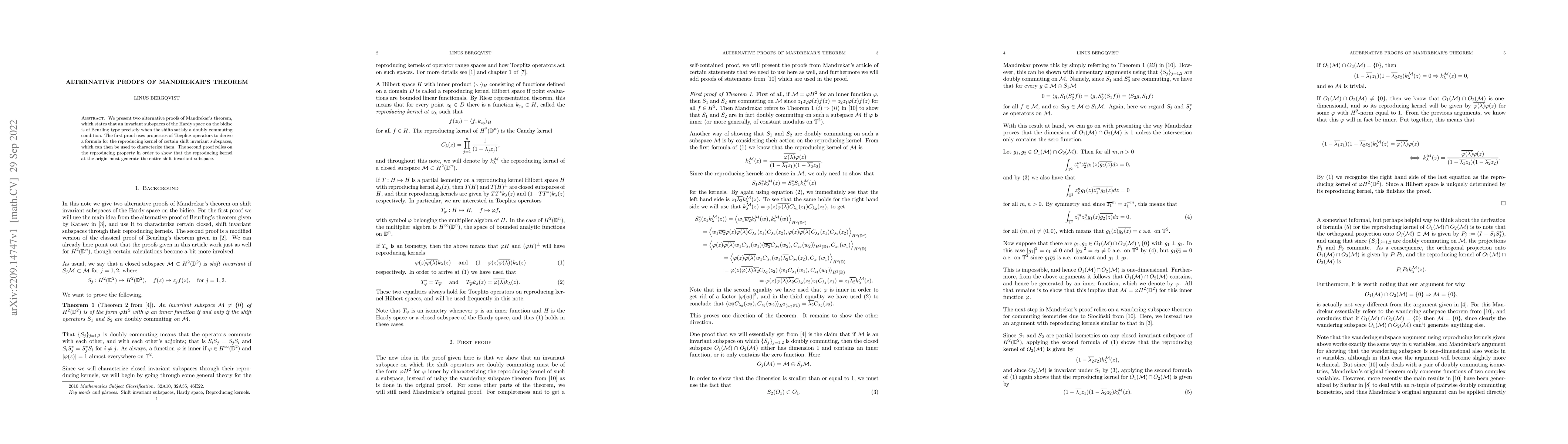 Summary: This paper provides two proofs of Mandrekar's theorem on invariant subspaces of the Hardy space on the bidisc, using Toeplitz operators and the reproducing kernel property to characterize the subspaces.