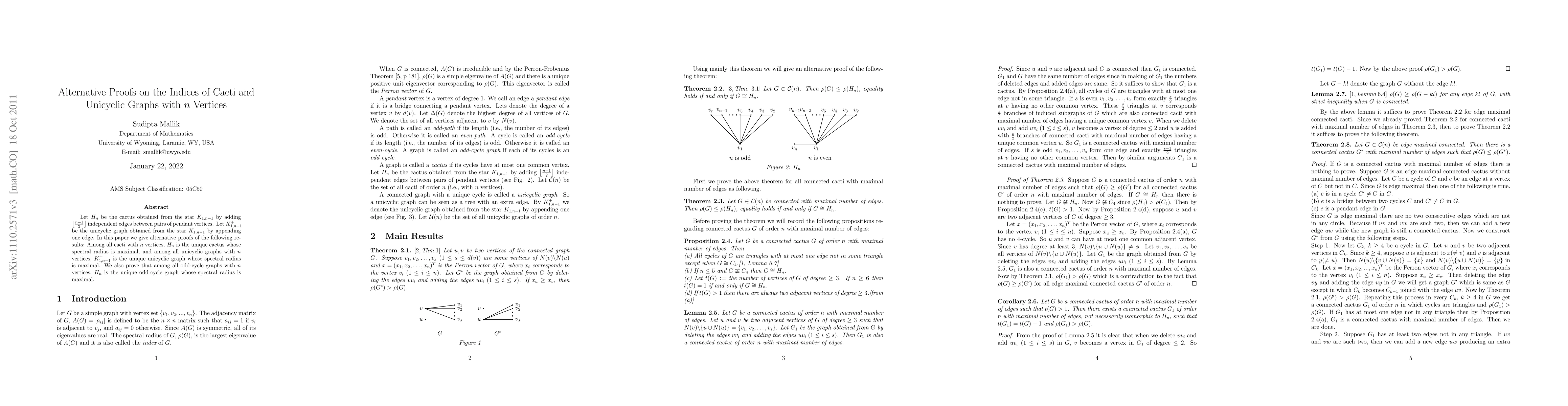 This paper provides alternative proofs for the maximal spectral radius among specific types of graphs: $H_n$ is the unique cactus with $n$ vertices having the highest spectral radius, $K_{1,n-1}^+$ is the unique unicyclic graph with $n$ vertices achieving the same, and $H_n$ is also the unique odd-cycle graph with $n$ vertices with the maximal spectral radius.