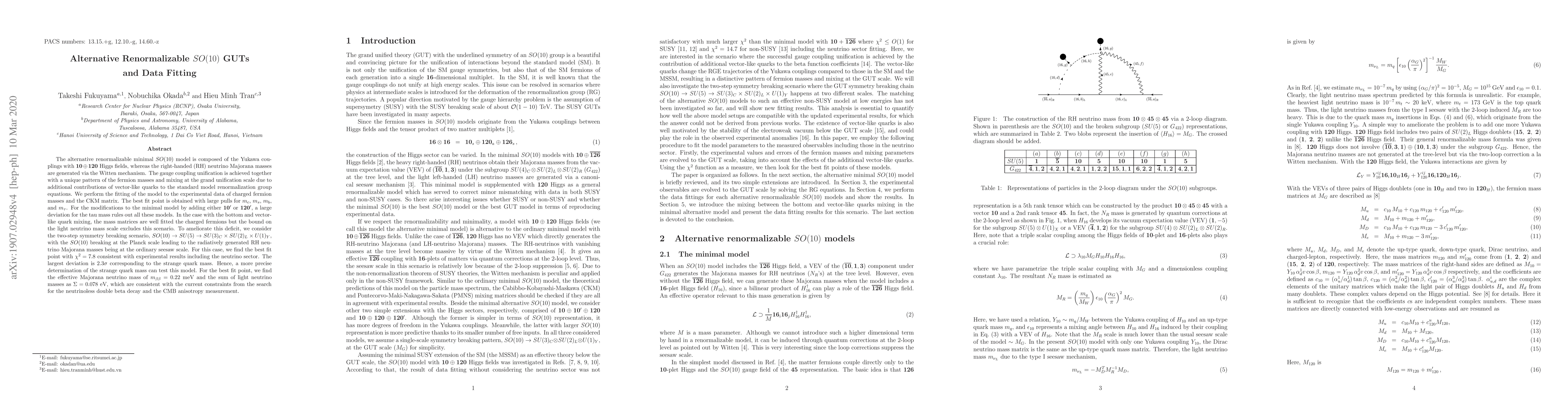 The alternative renormalizable minimal $SO(10)$ model is composed of the Yukawa couplings with $\textbf{10} \oplus \textbf{120}$ Higgs fields, whereas the right-handed (RH) neutrino Majorana masses are generated via the Witten mechanism. The gauge coupling unification is achieved together with a unique pattern of the fermion masses and mixing at the grand unification scale due to additional contributions of vector-like quarks to the standard model renormalization group equations. We perform the fitting of the model to the experimental data of charged fermion masses and the CKM matrix. The best fit point is obtained with large pulls for $m_c$, $m_s$, $m_b$, and $m_\tau$. For the modifications to the minimal model by adding either $\textbf{10}'$ or $\textbf{120}'$, a large deviation for the tau mass rules out all these models. In the case with the bottom and vector-like quark mixing, the mass matrices are well fitted the charged fermions but the bound on the light neutrino mass scale excludes this scenario. To ameliorate this deficit, we consider the two-step symmetry breaking scenario, $SO(10) \rightarrow SU(5) \rightarrow SU(3)_C \times SU(2)_L \times U(1)_Y$, with the $SO(10)$ breaking at the Planck scale leading to the radiatively generated RH neutrino Majorana masses being at the ordinary seesaw scale. For this case, we find the best fit point with $\chi^2 = 7.8$ consistent with experimental results including the neutrino sector. The largest deviation is 2.3$\sigma$ corresponding to the strange quark mass. Hence, a more precise determination of the strange quark mass can test this model. For the best fit point, we find the effective Majorana neutrino mass of $m_{\beta\beta} = 0.22$ meV and the sum of light neutrino masses as $\Sigma = 0.078$ eV, which are consistent with the current constraints from the search for the neutrinoless double beta decay and the CMB anisotropy measurement.