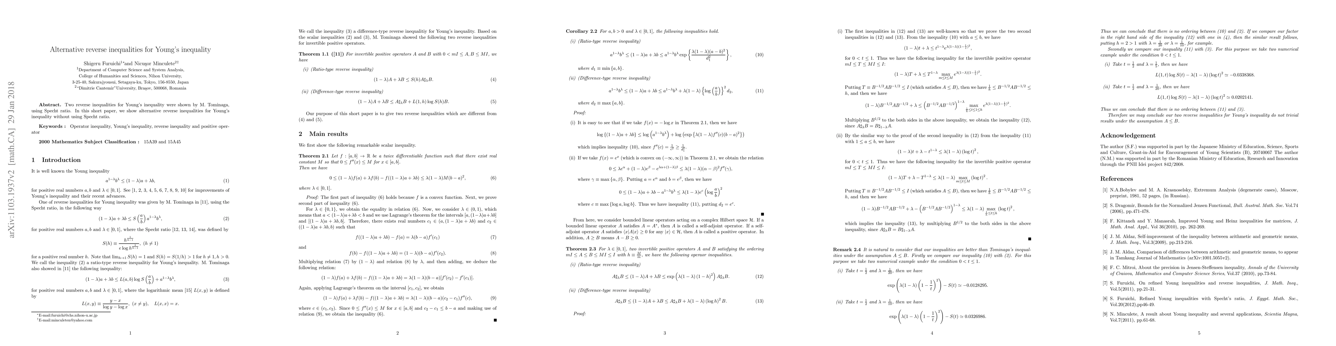 This paper presents alternative reverse inequalities for Young's inequality, offering new proofs that do not rely on the Specht ratio, unlike previous work by M. Tominaga. The findings provide new perspectives on the mathematical relationships within the inequality.