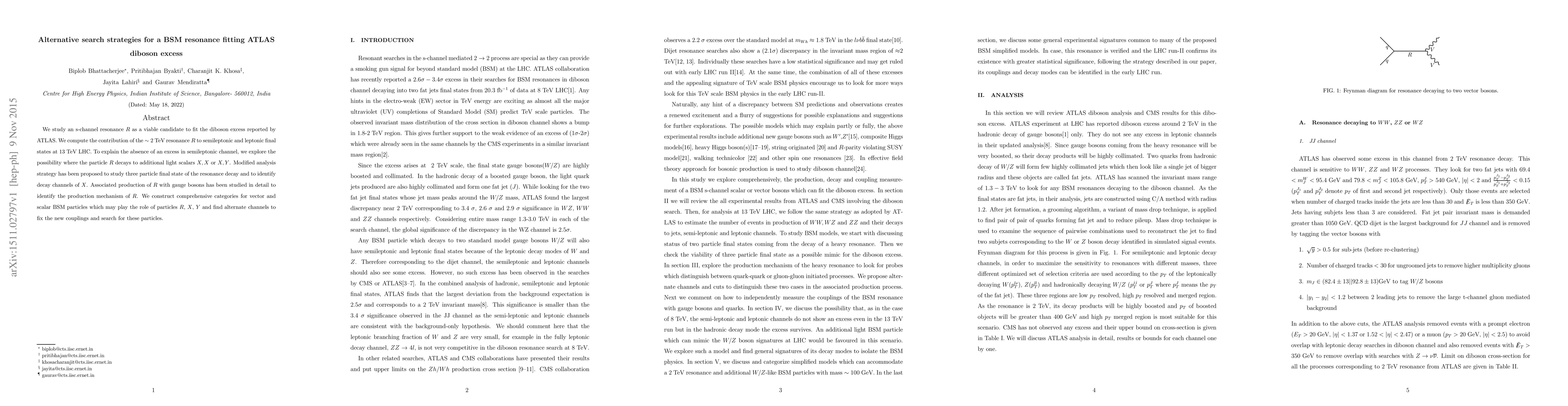 We study an s-channel resonance $R$ as a viable candidate to fit the diboson excess reported by ATLAS. We compute the contribution of the $\sim 2$ TeV resonance $R$ to semileptonic and leptonic final states at 13 TeV LHC. To explain the absence of an excess in semileptonic channel, we explore the possibility where the particle $R$ decays to additional light scalars $X,X$ or $X,Y$. Modified analysis strategy has been proposed to study three particle final state of the resonance decay and to identify decay channels of $X$. Associated production of $R$ with gauge bosons has been studied in detail to identify the production mechanism of $R$. We construct comprehensive categories for vector and scalar BSM particles which may play the role of particles $R$, $X$, $Y$ and find alternate channels to fix the new couplings and search for these particles.