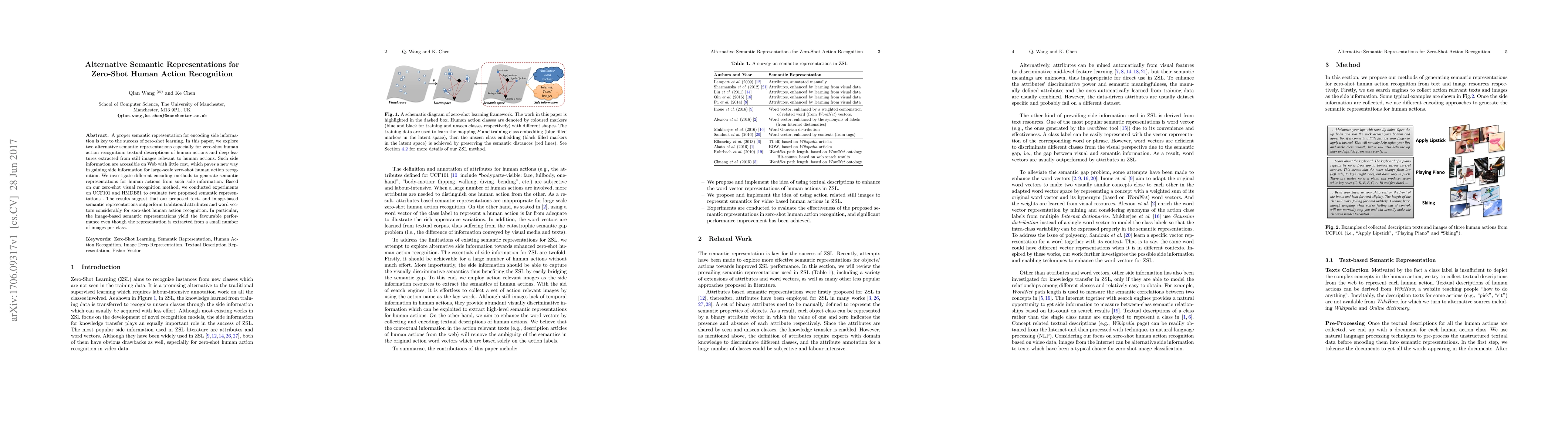 This paper proposes alternative semantic representations—textual descriptions and deep image features—for zero-shot human action recognition, demonstrating their effectiveness through experiments on UCF101 and HMDB51 datasets. The results show these new representations outperform traditional methods, especially the image-based representation.