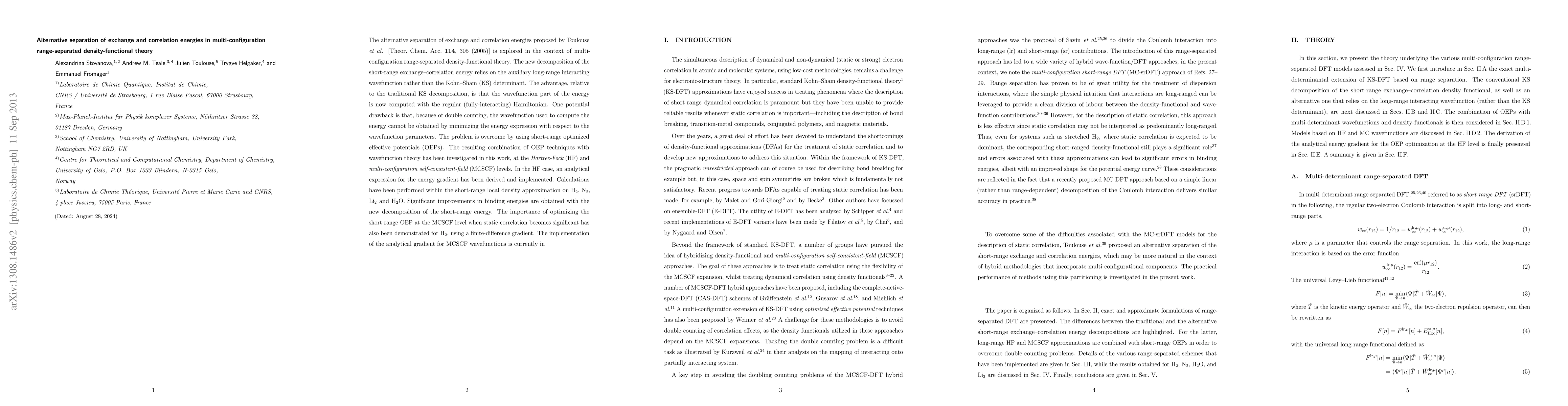 This paper explores an alternative separation of exchange and correlation energies in multi-configuration range-separated density-functional theory, utilizing optimized effective potentials for short-range interactions. The new method shows significant improvements in binding energies compared to traditional approaches, especially when static correlation is significant.
