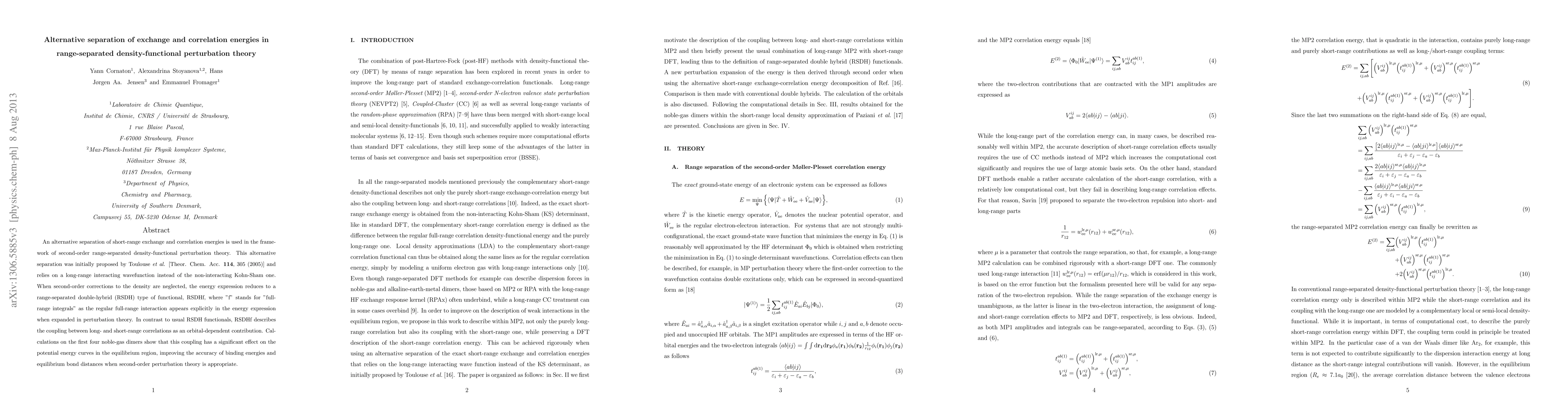 This paper proposes an alternative separation of short-range exchange and correlation in range-separated density-functional perturbation theory, leading to a new RSDHf functional that explicitly includes full-range interactions. This approach improves the accuracy of binding energies and equilibrium bond distances for noble-gas dimers by better describing the coupling between long- and short-range correlations.