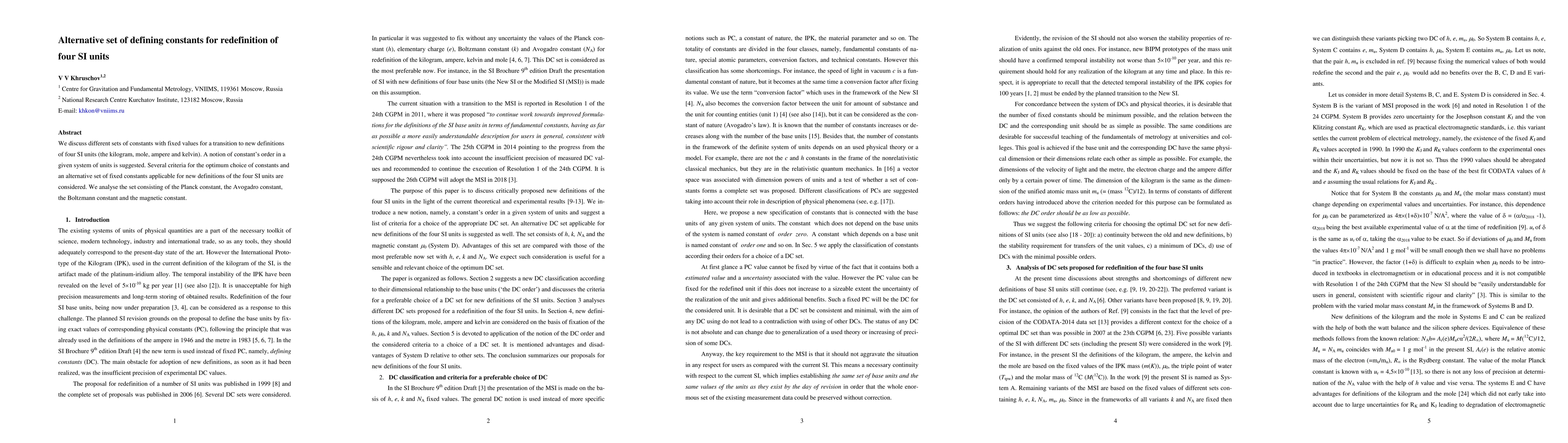 We discuss different sets of defining constants, fixed values of which are considered in connection with the transition to new definitions of four SI units (the kilogram, the mole, the ampere, and the kelvin). The notion of constant's order in a given system of units is suggested. We propose an alternative set of fixed constants applicable for new definitions of the four SI units. We analyse and discuss in detail the set, which consists of the Planck constant, the Avogadro constant, the Boltzmann constant and the magnetic constant.