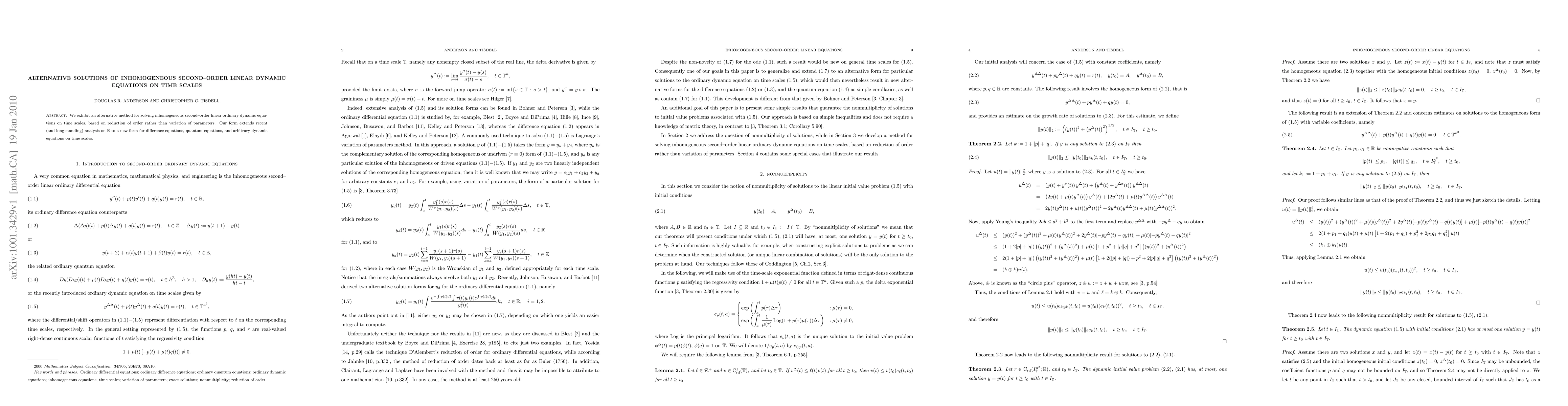 We exhibit an alternative method for solving inhomogeneous second--order linear ordinary dynamic equations on time scales, based on reduction of order rather than variation of parameters. Our form extends recent (and long-standing) analysis on $\R$ to a new form for difference equations, quantum equations, and arbitrary dynamic equations on time scales.