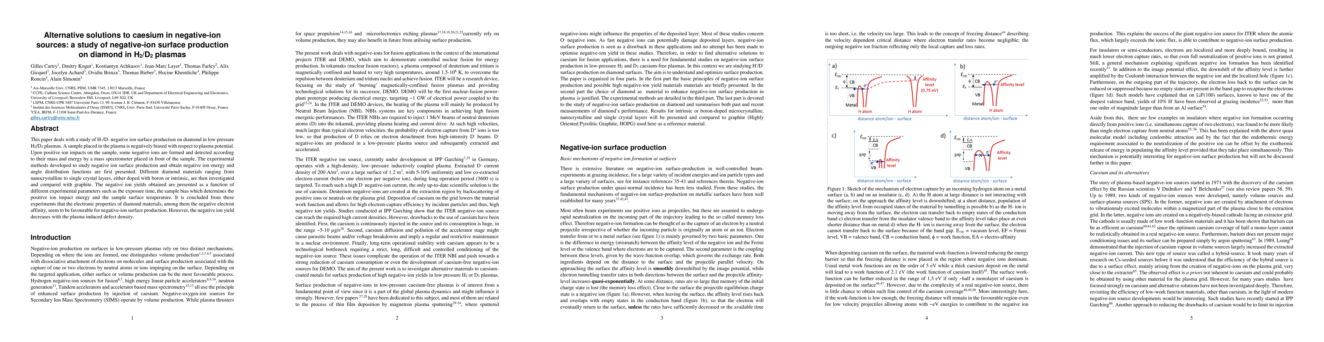 This study investigates H-/D-negative ion surface production on various diamond materials in low-pressure H2/D2 plasmas, finding that diamond's electronic properties favor negative-ion generation, though yields decline with increased plasma-induced defect density.