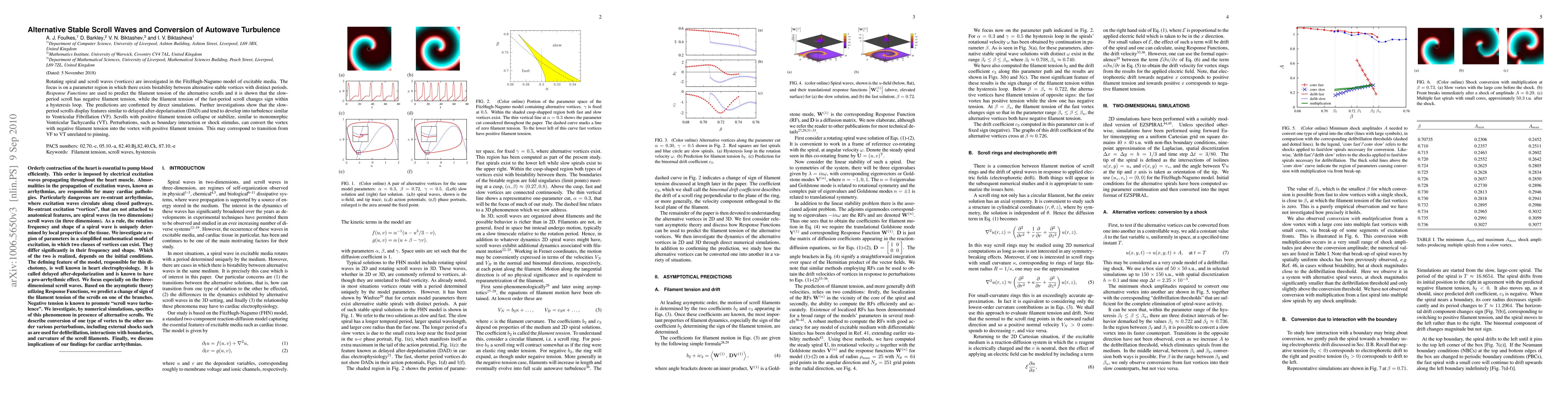 Rotating spiral and scroll waves (vortices) are investigated in the FitzHugh-Nagumo model of excitable media. The focus is on a parameter region in which there exists bistability between alternative stable vortices with distinct periods. Response Functions are used to predict the filament tension of the alternative scrolls and it is shown that the slow-period scroll has negative filament tension, while the filament tension of the fast-period scroll changes sign within a hysteresis loop. The predictions are confirmed by direct simulations. Further investigations show that the slow-period scrolls display features similar to delayed after-depolarisation (DAD) and tend to develop into turbulence similar to Ventricular Fibrillation (VF). Scrolls with positive filament tension collapse or stabilize, similar to monomorphic Ventricular Tachycardia (VT). Perturbations, such as boundary interaction or shock stimulus, can convert the vortex with negative filament tension into the vortex with positive filament tension. This may correspond to transition from VF to VT unrelated to pinning.