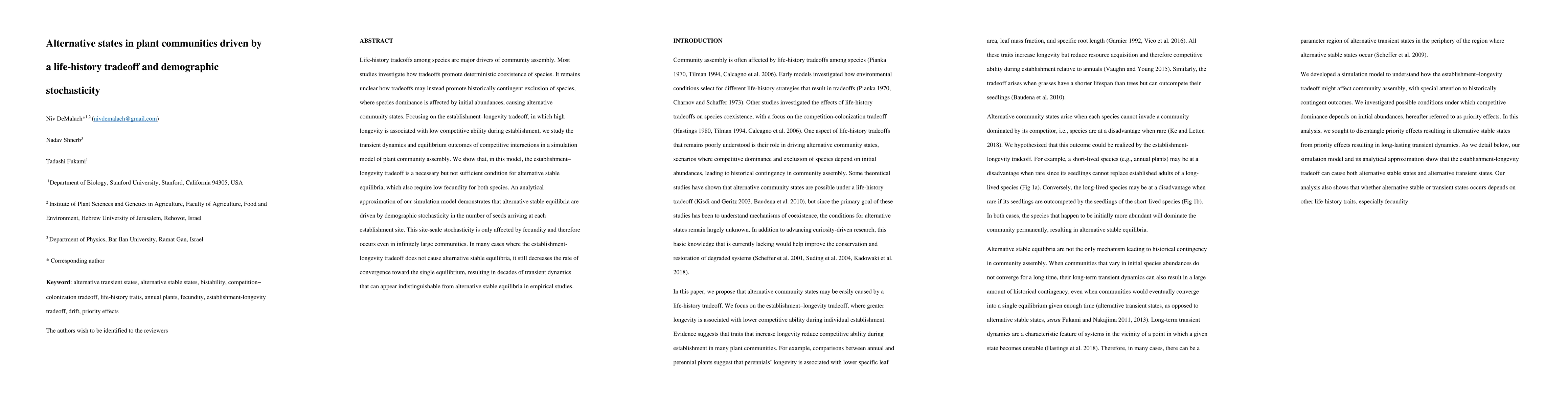 This paper explores how life-history tradeoffs and demographic stochasticity can lead to alternative stable states in plant communities. The study finds that while the establishment-longevity tradeoff is necessary, low fecundity is also required for alternative stable equilibria, driven by stochasticity in seed arrival.