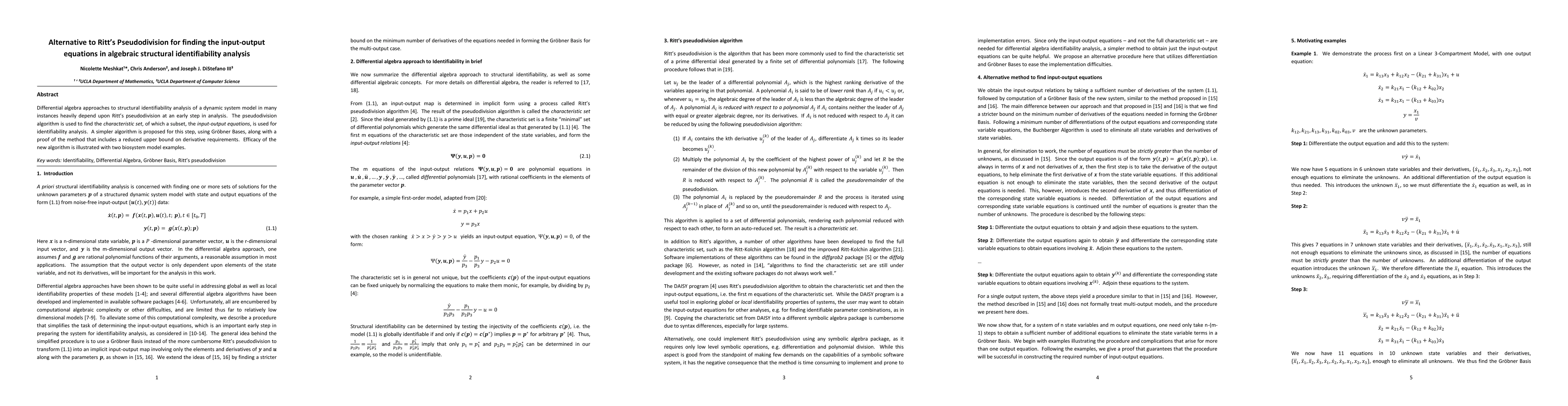 This paper proposes a simpler alternative to Ritt's pseudodivision for finding input-output equations in algebraic structural identifiability analysis, using Gröbner Bases instead. The new method includes a reduced upper bound on derivative requirements and is demonstrated to be effective in two biosystem model examples.