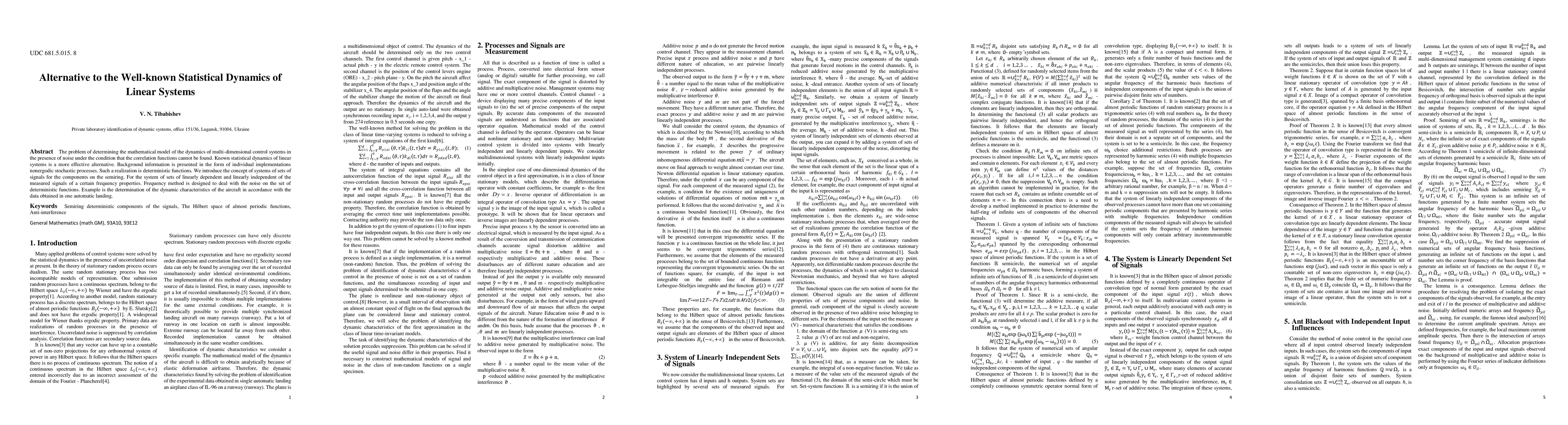 The problem of determining the mathematical model of the dynamics of multi-dimensional control systems in the presence of noise under the condition that the correlation functions cannot be found. Known statistical dynamics of linear systems is a more effective alternative. Background information is presented in the form of individual implementations nonergodic stochastic processes. Such a realization is deterministic functions. We introduce the concept of systems of sets of signals for the components on the semiring. For the system of sets of linearly dependent and linearly independent of the measured signals of a certain frequency properties. Frequency method is designed to deal with the noise on the set of deterministic functions. Example is the determination of the dynamic characteristics of the aircraft in accordance with the data obtained in one automatic landing.