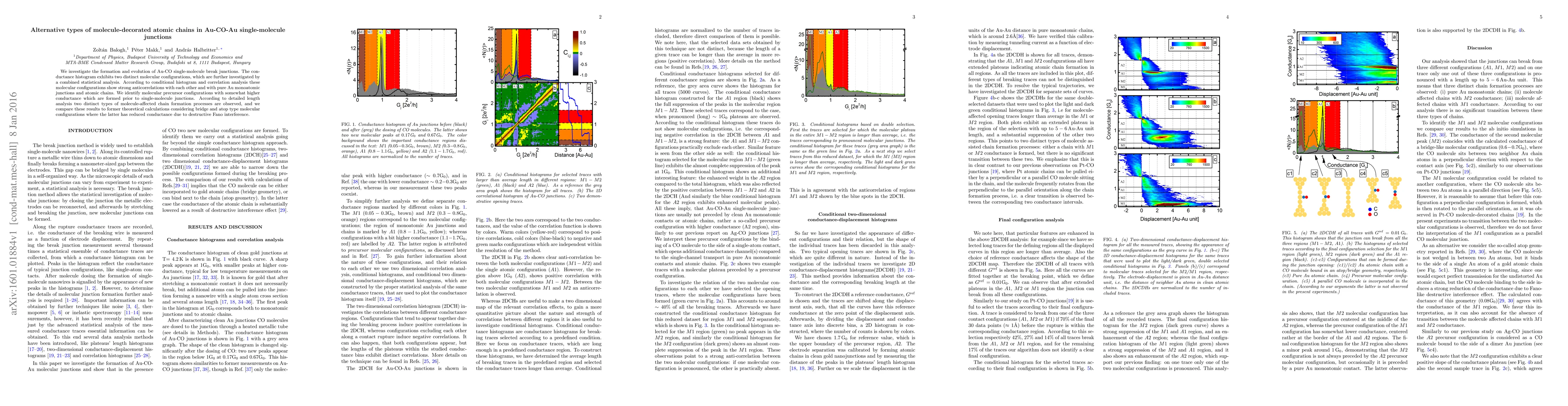 This paper investigates the formation of Au-CO single-molecule break junctions, identifying two distinct molecular configurations with strong anticorrelations. Detailed analysis reveals two types of molecule-decorated atomic chains, with the atop configuration showing reduced conductance due to destructive Fano interference.