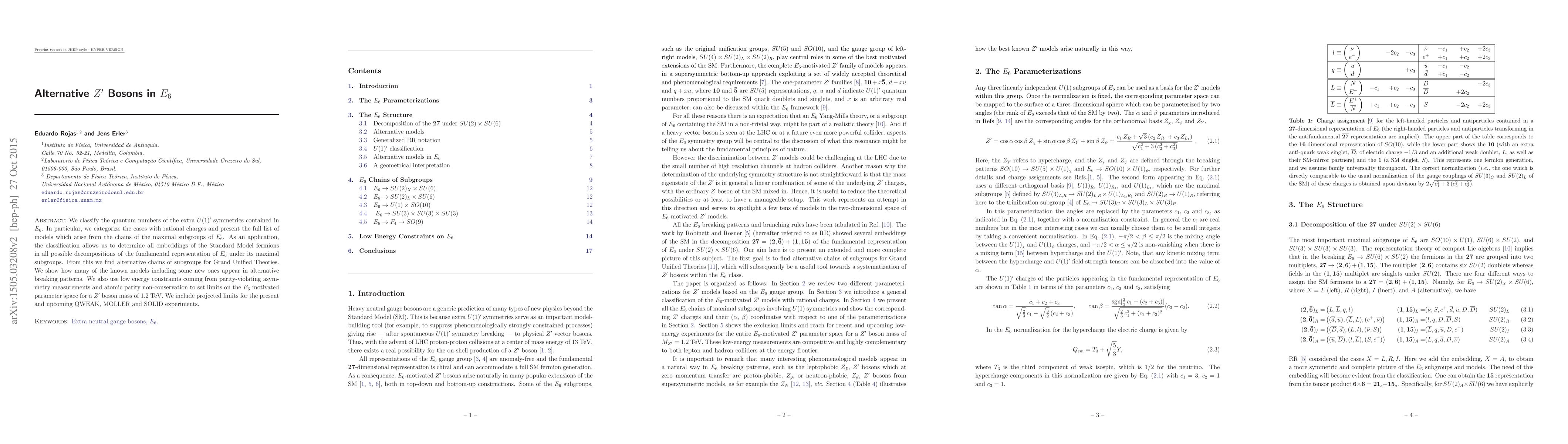 We classify the quantum numbers of the extra $U(1)'$ symmetries contained in $E_6$. In particular, we categorize the cases with rational charges and present the full list of models which arise from the chains of the maximal subgroups of $E_6$. As an application, the classification allows us to determine all embeddings of the Standard Model fermions in all possible decompositions of the fundamental representation of $E_6$ under its maximal subgroups. From this we find alternative chains of subgroups for Grand Unified Theories. We show how many of the known models including some new ones appear in alternative breaking patterns. We also use low energy constraints coming from parity-violating asymmetry measurements and atomic parity non-conservation to set limits on the $E_6$ motivated parameter space for a $Z'$ boson mass of~1.2~TeV. We include projected limits for the present and upcoming QWEAK, MOLLER and SOLID experiments.