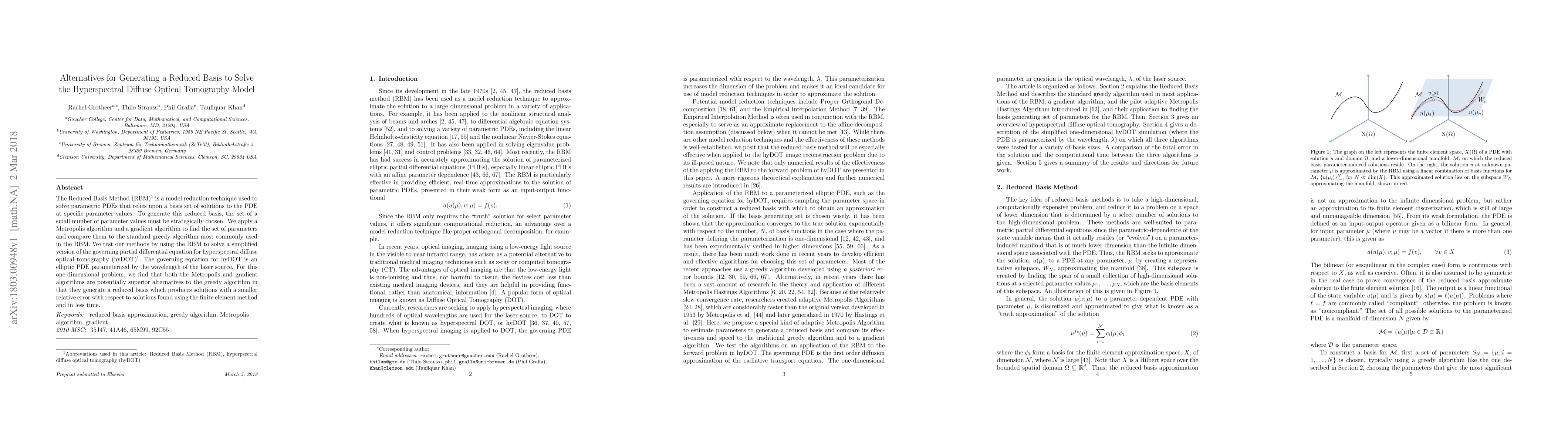 The Reduced Basis Method (RBM) is a model reduction technique used to solve parametric PDEs that relies upon a basis set of solutions to the PDE at specific parameter values. To generate this reduced basis, the set of a small number of parameter values must be strategically chosen. We apply a Metropolis algorithm and a gradient algorithm to find the set of parameters and compare them to the standard greedy algorithm most commonly used in the RBM. We test our methods by using the RBM to solve a simplified version of the governing partial differential equation for hyperspectral diffuse optical tomography (hyDOT). The governing equation for hyDOT is an elliptic PDE parameterized by the wavelength of the laser source. For this one-dimensional problem, we find that both the Metropolis and gradient algorithms are potentially superior alternatives to the greedy algorithm in that they generate a reduced basis which produces solutions with a smaller relative error with respect to solutions found using the finite element method and in less time.