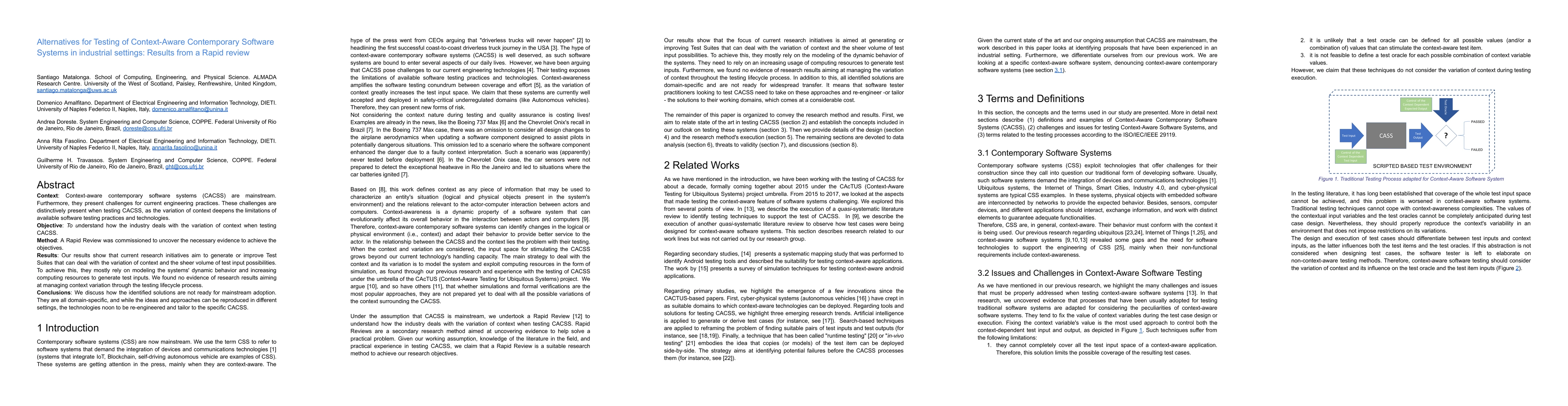 Context: Context-aware contemporary software systems (CACSS) are mainstream. Furthermore, they present challenges for current engineering practices. These challenges are distinctively present when testing CACSS, as the variation of context deepens the limitations of available software testing practices and technologies. Objective: To understand how the industry deals with the variation of context when testing CACSS. Method: A Rapid Review was commissioned to uncover the necessary evidence to achieve the objectives. Results: Our results show that current research initiatives aim to generate or improve Test Suites that can deal with the variation of context and the sheer volume of test input possibilities. To achieve this, they mostly rely on modelling the systems' dynamic behavior and increasing computing resources to generate test inputs. We found no evidence of research results aiming at managing context variation through the testing lifecycle process. Conclusions: We discuss how the identified solutions are not ready for mainstream adoption. They are all domain-specific, and while the ideas and approaches can be reproduced in different settings, the technologies noon to be re-engineered and tailor to the specific CACSS.