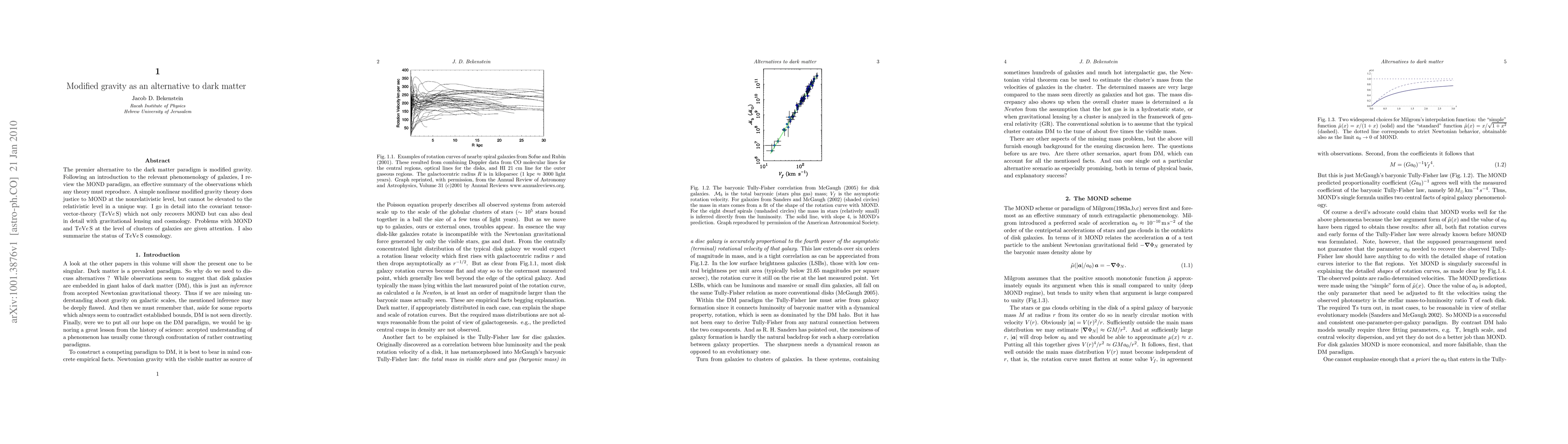 The premier alternative to the dark matter paradigm is modified gravity. Following an introduction to the relevant phenomenology of galaxies, I review the MOND paradigm, an effective summary of the observations which any theory must reproduce. A simple nonlinear modified gravity theory does justice to MOND at the nonrelativistic level, but cannot be elevated to the relativistic level in a unique way. I go in detail into the covariant tensor-vector-theory (TeVeS) which not only recovers MOND but can also deal in detail with gravitational lensing and cosmology. Problems with MOND and TeVeS at the level of clusters of galaxies are given attention. I also summarize the status of TeVeS cosmology.