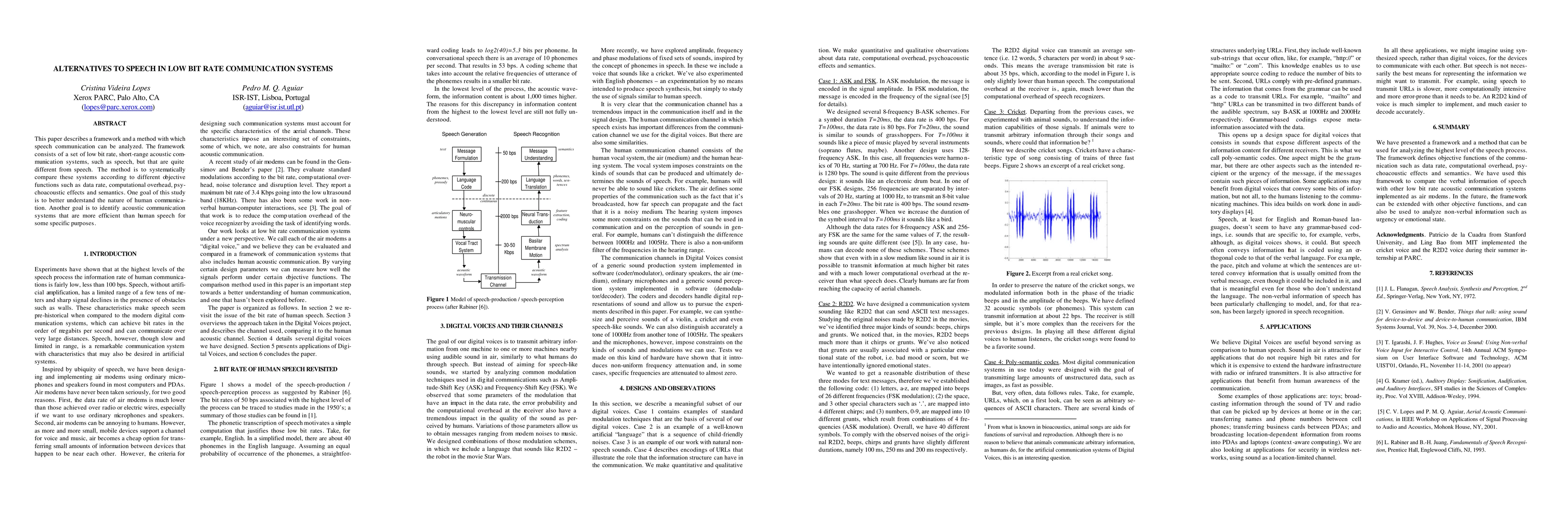 This paper describes a framework and a method with which speech communication can be analyzed. The framework consists of a set of low bit rate, short-range acoustic communication systems, such as speech, but that are quite different from speech. The method is to systematically compare these systems according to different objective functions such as data rate, computational overhead, psychoacoustic effects and semantics. One goal of this study is to better understand the nature of human communication. Another goal is to identify acoustic communication systems that are more efficient than human speech for some specific purposes.