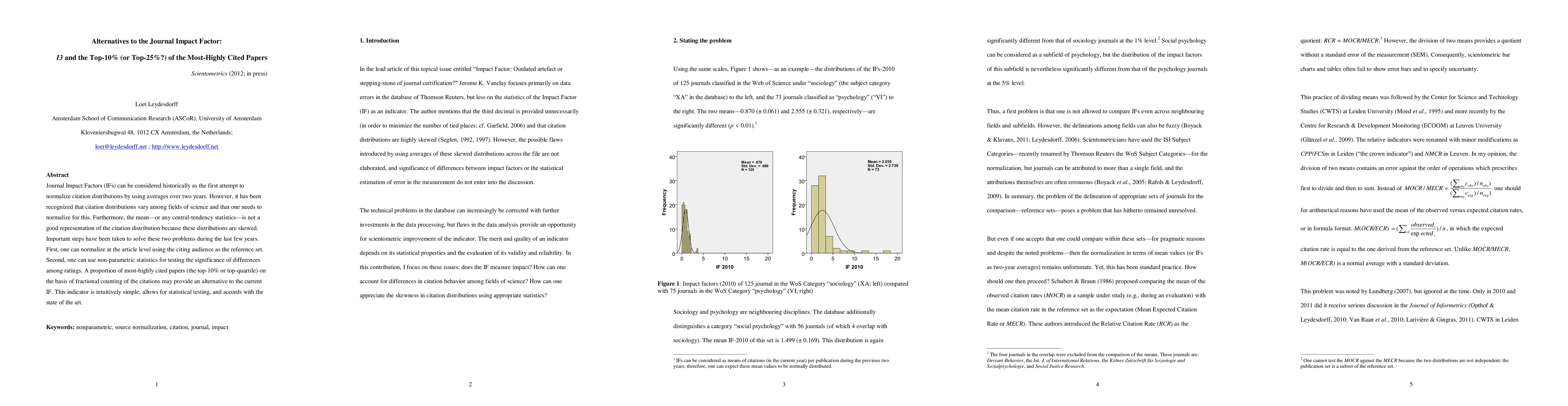 Journal Impact Factors (IFs) can be considered historically as the first attempt to normalize citation distributions by using averages over two years. However, it has been recognized that citation distributions vary among fields of science and that one needs to normalize for this. Furthermore, the mean-or any central-tendency statistics-is not a good representation of the citation distribution because these distributions are skewed. Important steps have been taken to solve these two problems during the last few years. First, one can normalize at the article level using the citing audience as the reference set. Second, one can use non-parametric statistics for testing the significance of differences among ratings. A proportion of most-highly cited papers (the top-10% or top-quartile) on the basis of fractional counting of the citations may provide an alternative to the current IF. This indicator is intuitively simple, allows for statistical testing, and accords with the state of the art.