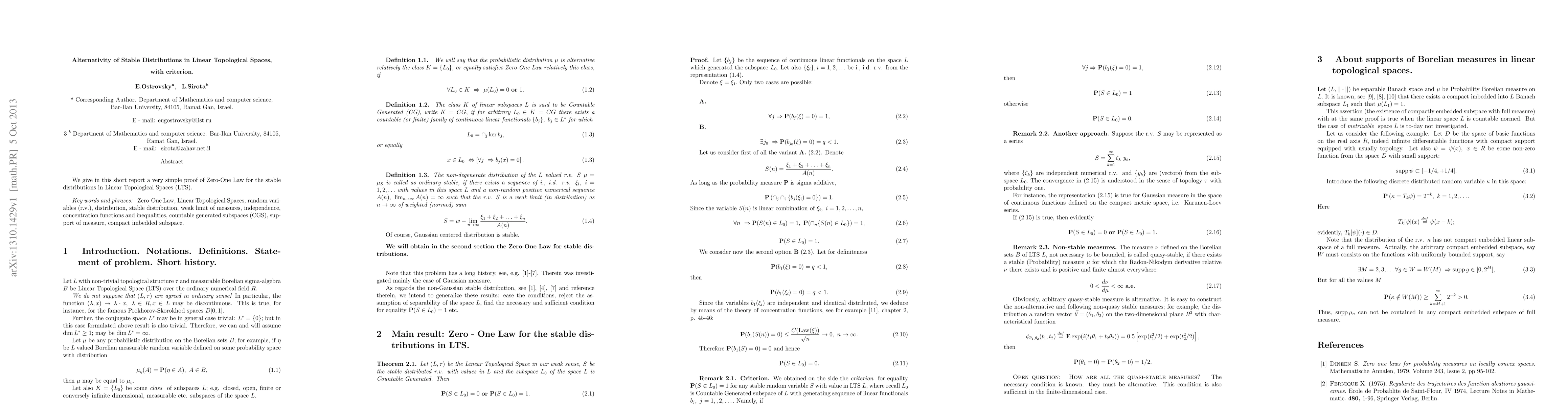 We give in this short report a very simple proof of Zero-One Law for the stable distributions in Linear Topological Spaces (LTS).