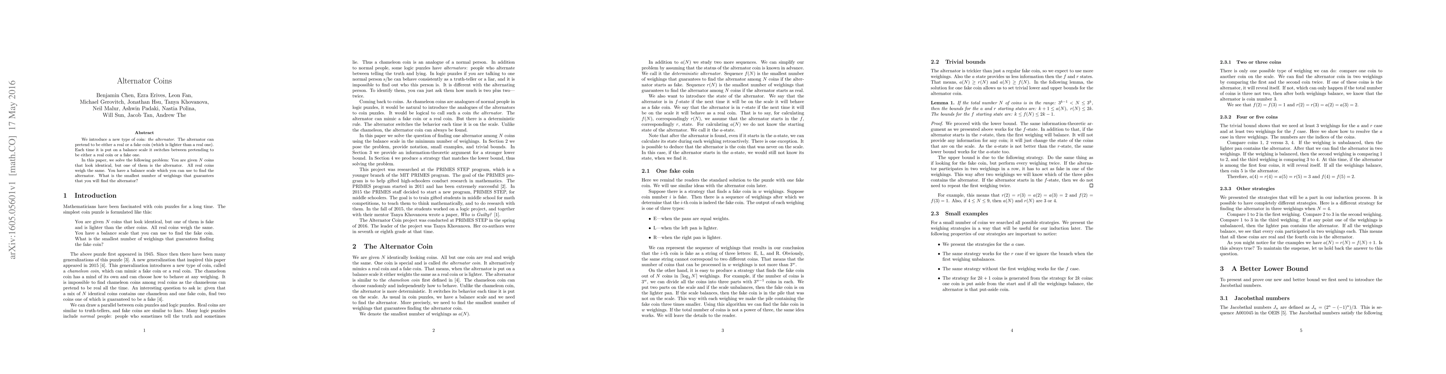 We introduce a new type of coin: \textit{the alternator}. The alternator can pretend to be either a real or a fake coin (which is lighter than a real one). Each time it is put on a balance scale it switches between pretending to be either a real coin or a fake one. In this paper, we solve the following problem: You are given $N$ coins that look identical, but one of them is the alternator. All real coins weigh the same. You have a balance scale which you can use to find the alternator. What is the smallest number of weighings that guarantees that you will find the alternator?