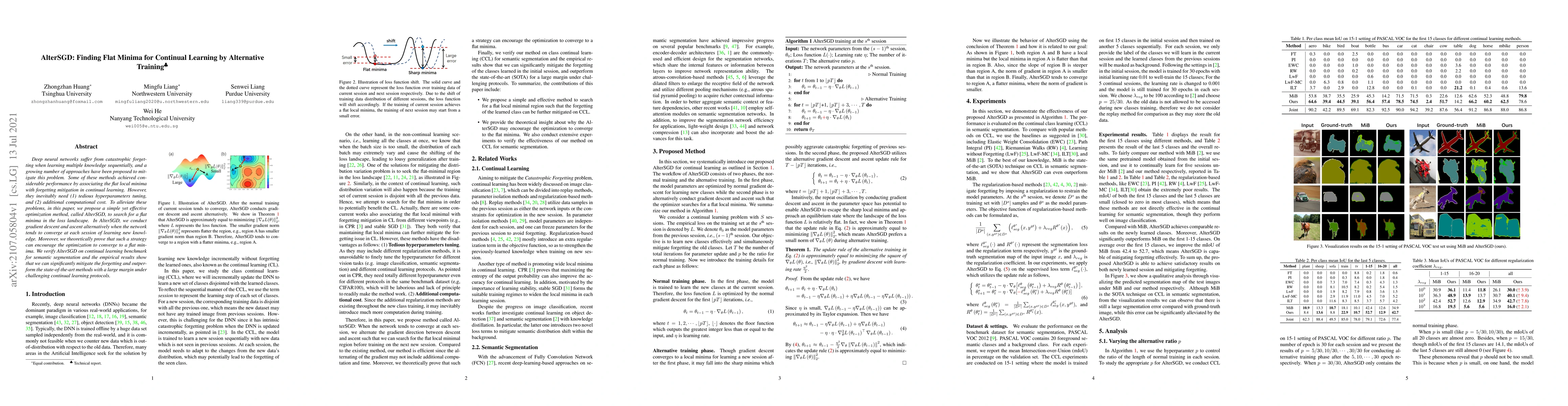Deep neural networks suffer from catastrophic forgetting when learning multiple knowledge sequentially, and a growing number of approaches have been proposed to mitigate this problem. Some of these methods achieved considerable performance by associating the flat local minima with forgetting mitigation in continual learning. However, they inevitably need (1) tedious hyperparameters tuning, and (2) additional computational cost. To alleviate these problems, in this paper, we propose a simple yet effective optimization method, called AlterSGD, to search for a flat minima in the loss landscape. In AlterSGD, we conduct gradient descent and ascent alternatively when the network tends to converge at each session of learning new knowledge. Moreover, we theoretically prove that such a strategy can encourage the optimization to converge to a flat minima. We verify AlterSGD on continual learning benchmark for semantic segmentation and the empirical results show that we can significantly mitigate the forgetting and outperform the state-of-the-art methods with a large margin under challenging continual learning protocols.