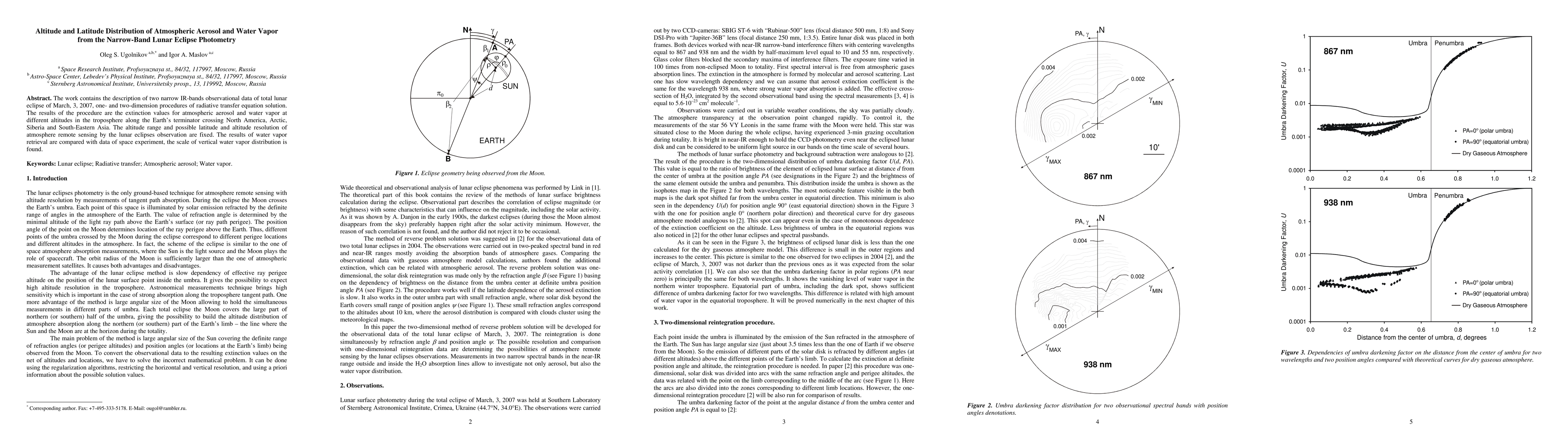 This research uses narrow-band IR photometry of the 2007 lunar eclipse to determine atmospheric aerosol and water vapor extinction at various altitudes over North America, Arctic, Siberia, and South-Eastern Asia. It compares water vapor retrieval results with space experiment data, revealing the scale of vertical water vapor distribution in the troposphere.